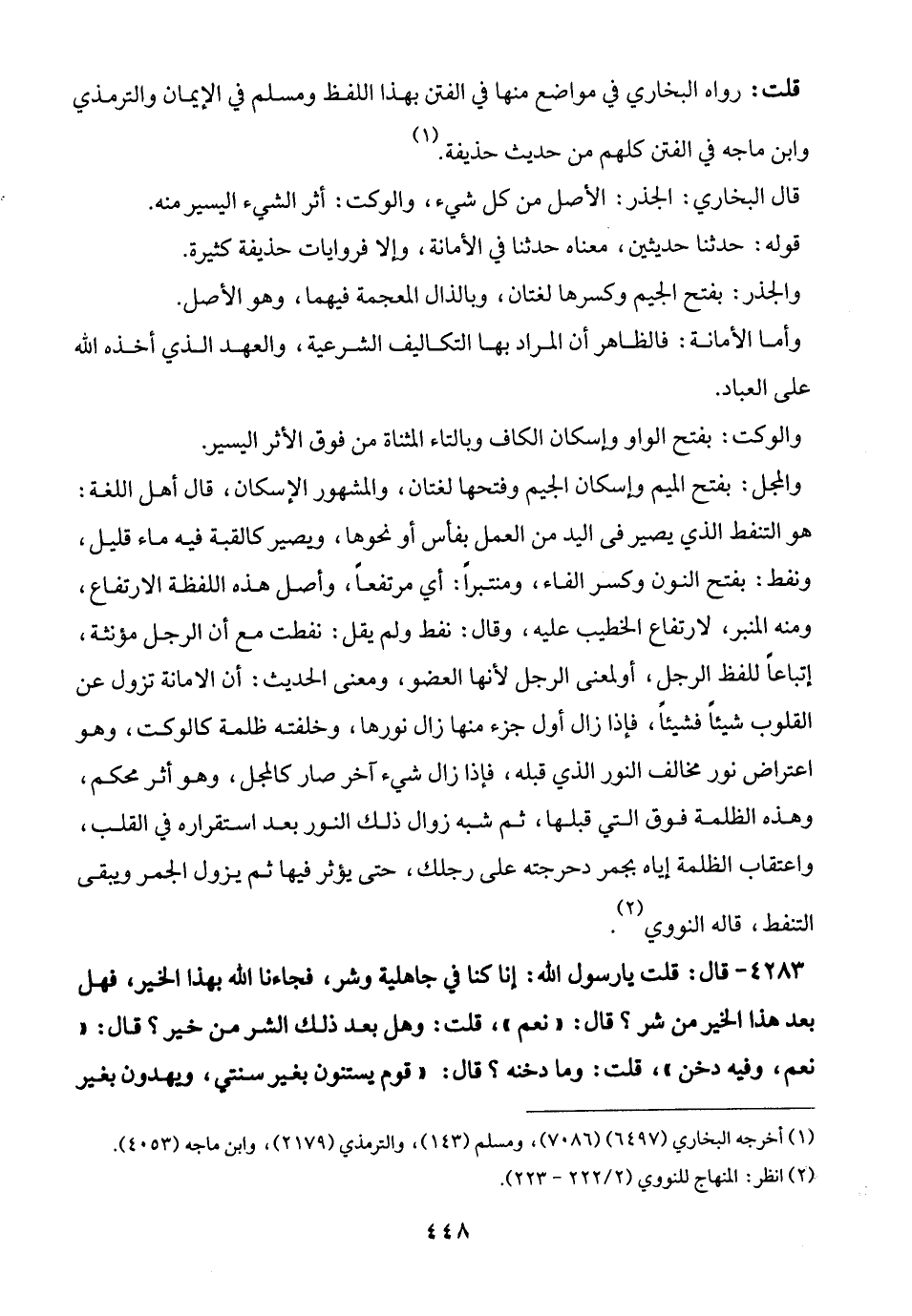 4283 - قال: قلت يا رسول الله: إنا كنا في جاهلية وشر، فجاءنا الله بهذا الخير، فهل بعد هذا الخير من شر؟ قال: "نعم"، قلت: وهل بعد ذلك الشر من خير؟ قال: "نعم، وفيه دخن"، قلت: وما دخنه؟ قال: "قوم يستنون بغير سنتي، ويهدون بغير