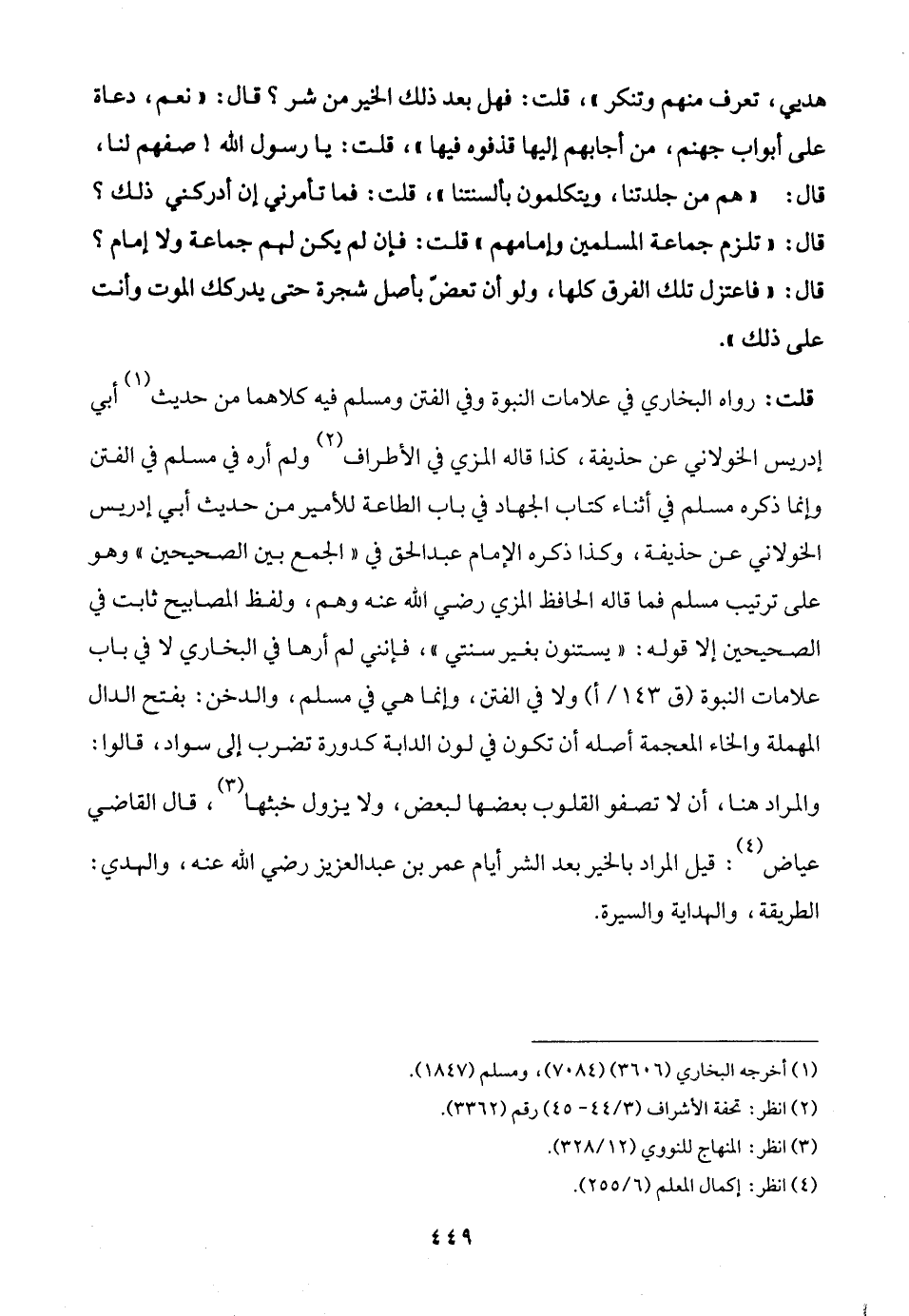 هديي، تعرف منهم وتنكر"، قلت: فهل بعد ذلك الخير من شر؟ قال: "نعم، دعاة على أبواب جهنم، من أجابهم إليها قذفوه فيها"، قلت: يا رسول الله! صفهم لنا، قال: "هم من جلدتنا، ويتكلمون بألسنتنا"، قلت: فما تأمرني إن أدركني ذلك؟ قال: "تلزم جماعة المسلمين وإمامهم" قلت: فإن لم يكن لهم جماعة ولا إمام؟ قال: "فاعتزل تلك الفرق كلها, ولو أن تعضّ بأصل شجرة حتى يدركك الموت وأنت على ذلك".