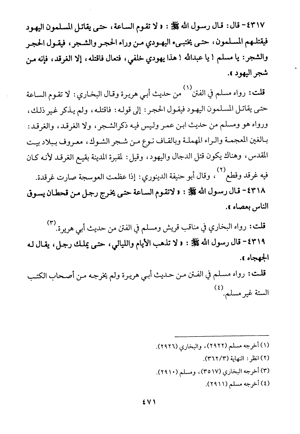 4317 - قال: قال رسول الله - صلى الله عليه وسلم -: "لا تقوم الساعة، حتى يقاتل المسلمون اليهود فيقتلهم المسلمون، حتى يختبىء اليهودي من وراء الحجر والشجر، فيقول الحجر والشجر: يا مسلم! يا عبد الله! هذا يهودي خلفي، فتعال فاقتله، إلا الغرقد، فإنه من شجر اليهود".