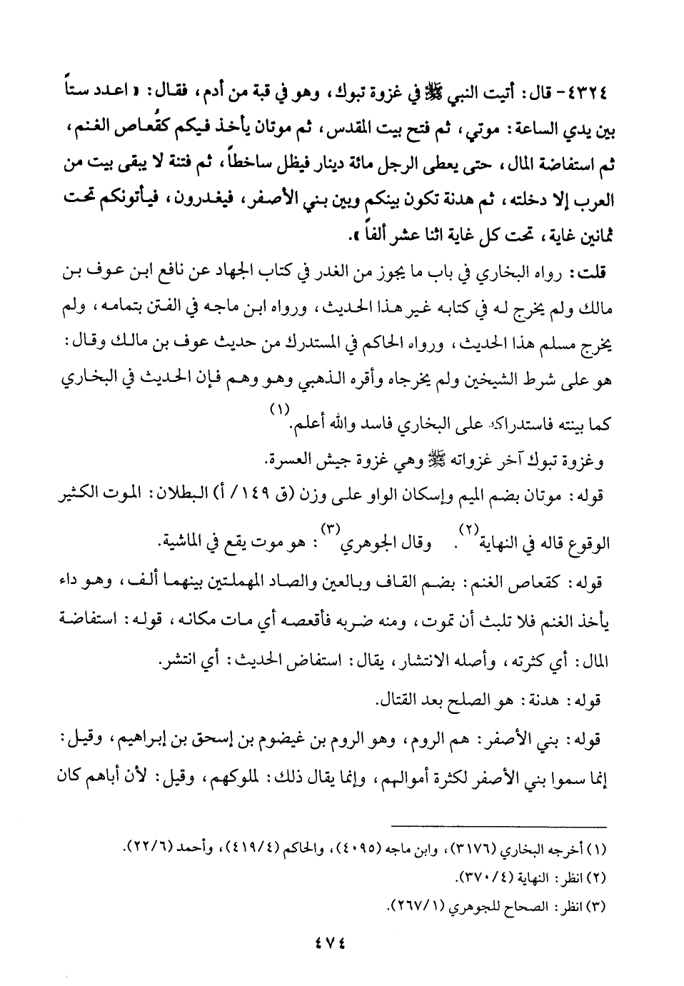 4324 - قال: أتيت النبي - صلى الله عليه وسلم - في غزوة تبوك، وهو في قبة من أدم، فقال: "اعدد ستًّا بين يدي الساعة: موتي، ثم فتح بيت المقدس، ثم موتان يأخذ فيكم كقُعاص الغنم، ثم استفاضة المال، حتى يعطى الرجل مائة دينار فيظل ساخطًا، ثم فتنة لا يبقى بيت من العرب إلا دخلته، ثم هدنة تكون بينكم وبين بني الأصفر، فيغدرون، فيأتونكم تحت ثمانين غاية، تحت كل غاية اثنا عشر ألفًا".
