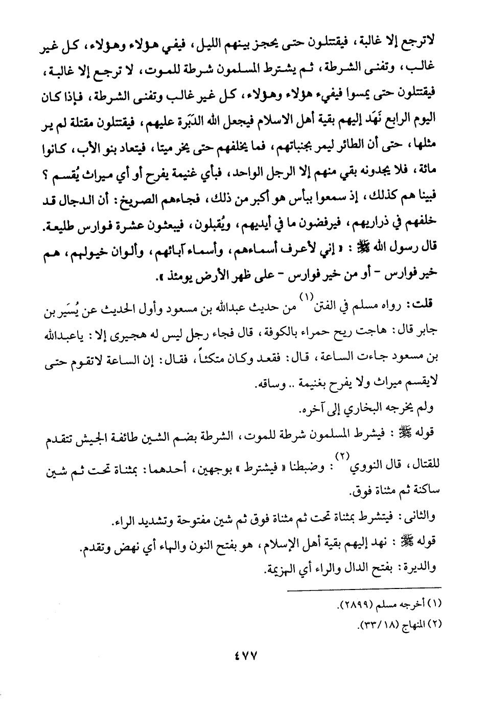 لا ترجع إلا غالبة، فيقتتلون حتى يحجز بينهم الليل، فيفيء هؤلاء وهؤلاء، كل غير غالب، وتفنى الشرطة، ثم يشترط المسلمون شرطة للموت، لا ترجع إلا غالبة, فيقتتلون حتى يمسوا فيفيء هؤلاء وهؤلاء، كل غير غالب وتفنى الشرطة، فإذا كان اليوم الرابع نَهَد إليهم بقية أهل الاسلام فيجعل الله الدَبَرة عليهم، فيقتتلون مقتلة لم ير مثلها، حتى أن الطائر ليمر بجنباتهم، فما يخلفهم حتى يخر ميتا، فيتعاد بنو الأب، كانوا مائة، فلا يجدونه بقي منهم إلا الرجل الواحد، فبأي غنيمة يفرح أو أي ميراث يُقسم؟ فبينا هم كذلك، إذ سمعوا ببأس هو أكبر من ذلك، فجاءهم الصريخ: أن الدجال قد خلفهم في ذراريهم، فيرفضون ما في أيديهم، ويُقبلون، فيبعثون عشرة فوارس طليعة. قال رسول الله - صلى الله عليه وسلم -: "إني لأعرف أسماءهم، وأسماء آبائهم، وألوان خيولهم، هم خير فوارس -أو من خير فوارس- على ظهر الأرض يومئذ".
