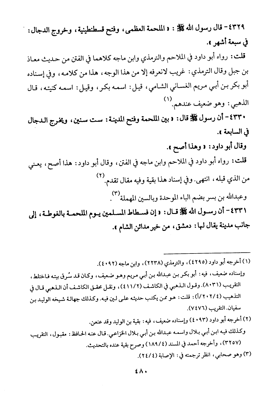 4329 - قال رسول الله - صلى الله عليه وسلم -: "الملحمة العظمى، وفتح قسطنطينية، وخروج الدجال: في سبعة أشهر".