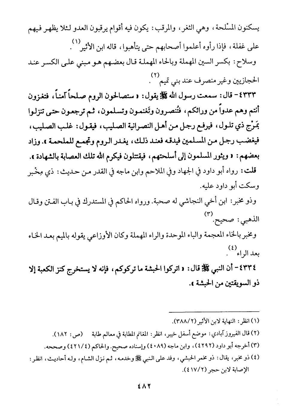 4334 - أن النبي - صلى الله عليه وسلم - قال: "اتركوا الحبشة ما تركوكم، فإنه لا يستخرج كنز الكعبة إلا ذو السويقتين من الحبشة".