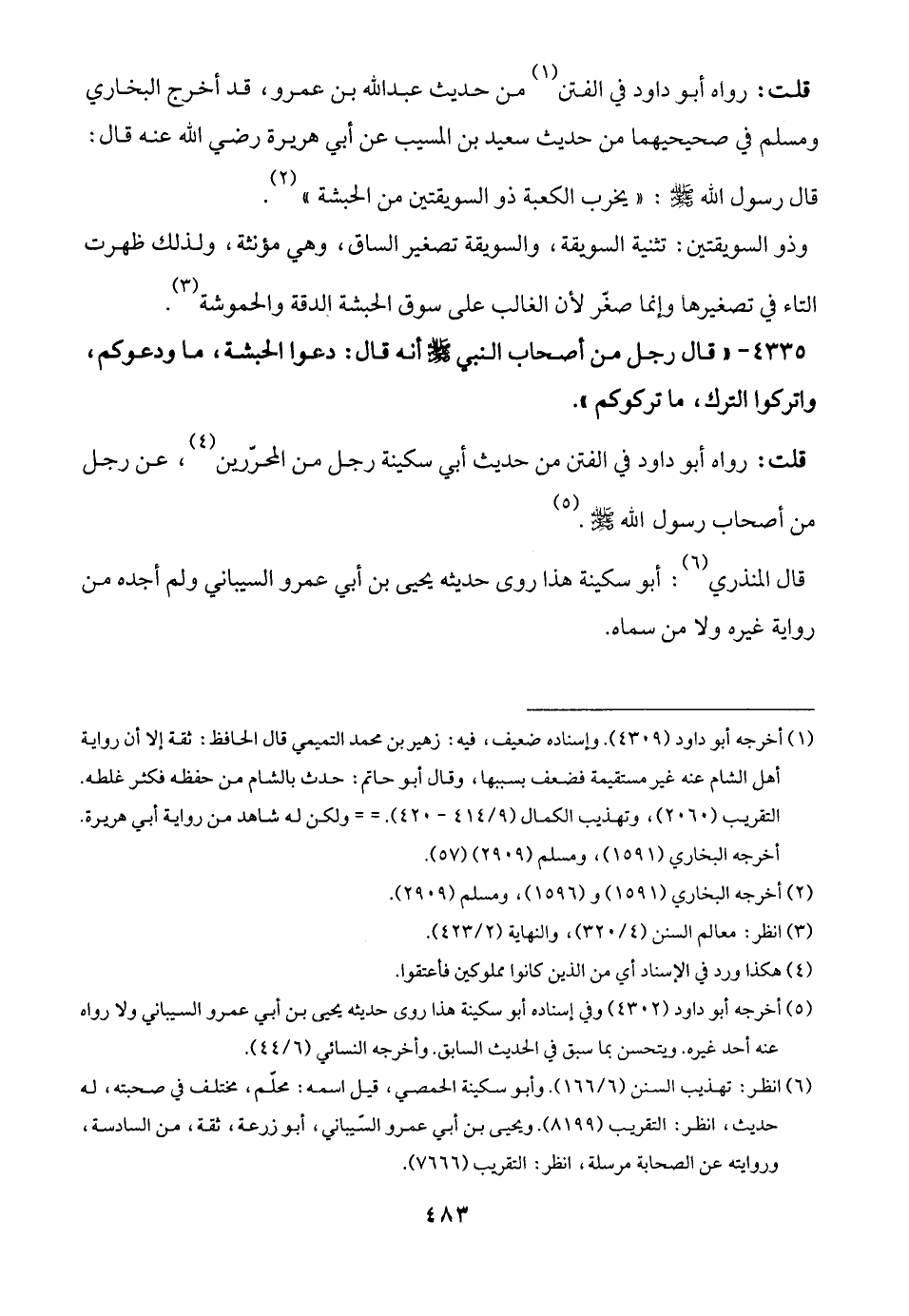 قلت: رواه أبو داود في الفتن (¬1) من حديث عبد الله بن عمرو، قد أخرج البخاري ومسلم في صحيحيهما من حديث سعيد بن المسيب عن أبي هريرة رضي الله عنه قال: قال رسول الله - صلى الله عليه وسلم -: "يخرب الكعبة ذو السويقتين من الحبشة" (¬2).