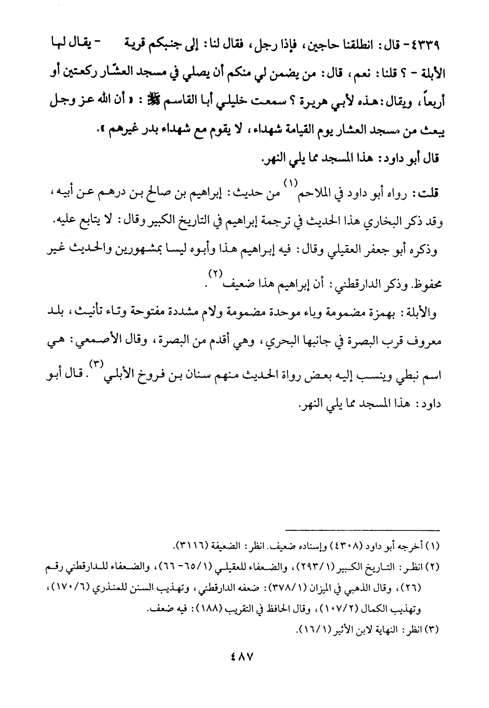 والأبلة: بهمزة مضمومة وباء موحدة مضمومة ولام مشددة مفتوحة وتاء تأنيث، بلد معروف قرب البصرة في جانبها البحري، وهي أقدم من البصرة، وقال الأصمعي: هي اسم نبطي وينسب إليه بعض رواة الحديث منهم سنان بن فروخ الأبلي (¬3). قال أبو داود: هذا المسجد مما يلي النهر.