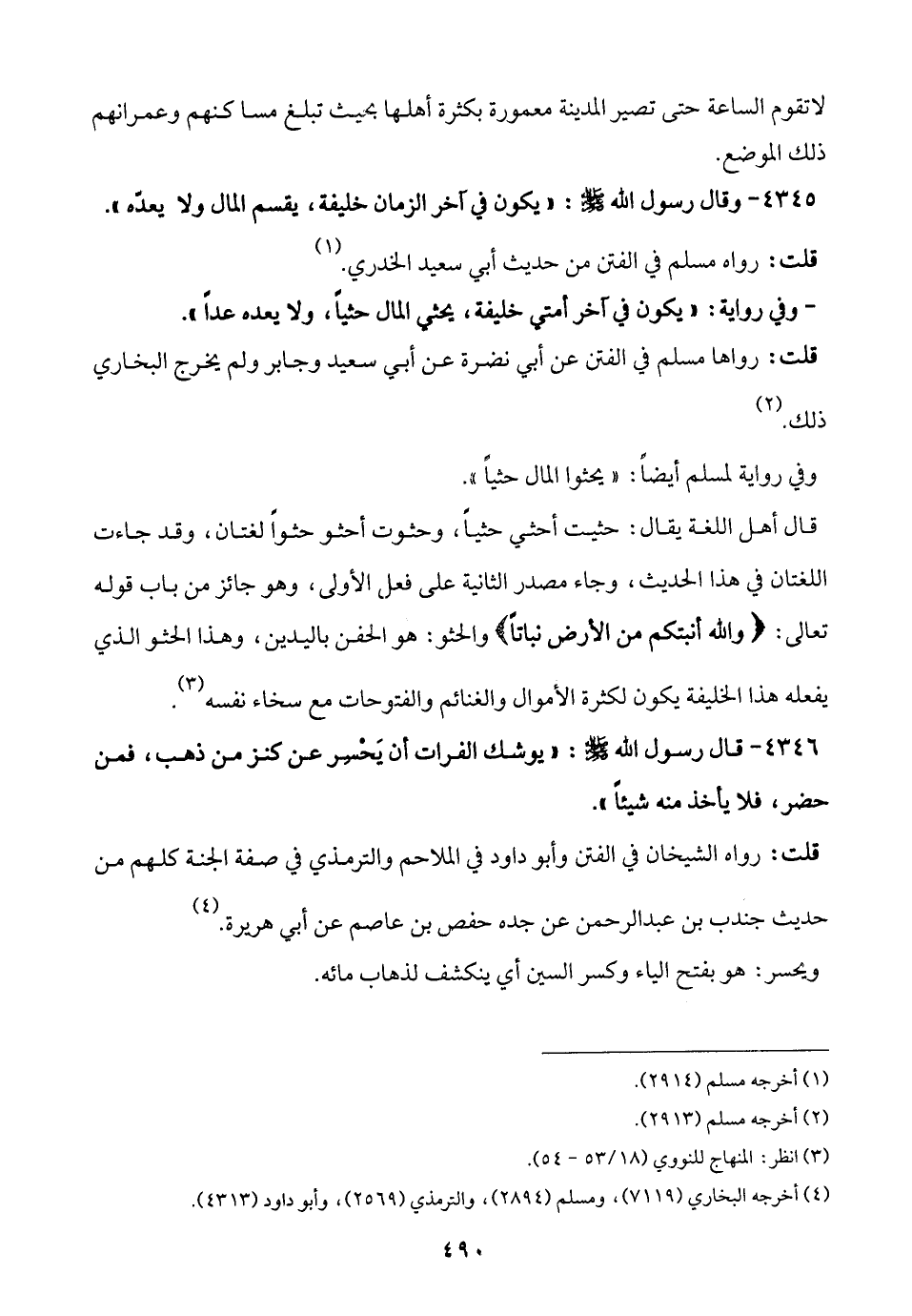 - وفي رواية: "يكون في آخر أمتي خليفة، يحثي المال حثيًا، ولا يعده عدًّا".
