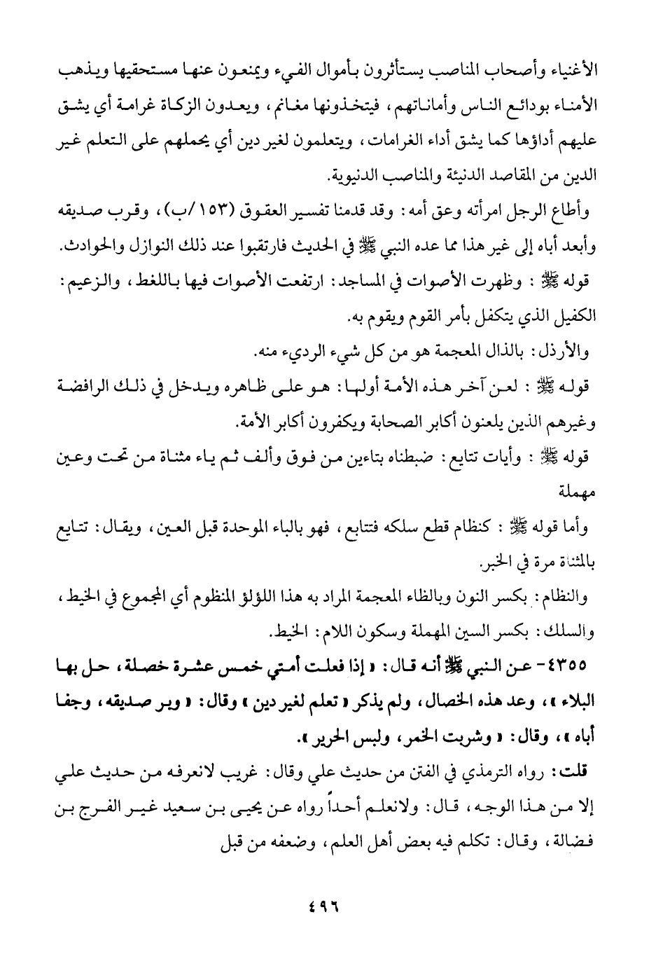 4355 - عن النبي - صلى الله عليه وسلم - أنه قال: "إذا فعلت أمتي خمس عشرة خصلة، حل بها البلاء"، وعد هذه الخصال، ولم يذكر "تعلم لغير دين" وقال: "وبر صديقه، وجفا أباه"، وقال: "وشربت الخمر، ولبس الحرير".