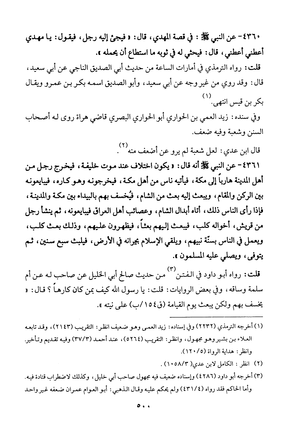 4360 - عن النبي - صلى الله عليه وسلم -: في قصة المهدي، قال: "فيجئ إليه رجل، فيقول: يا مهدي أعطني أعطني، قال: فيحثي له في ثوبه ما استطاع أن يحمله".