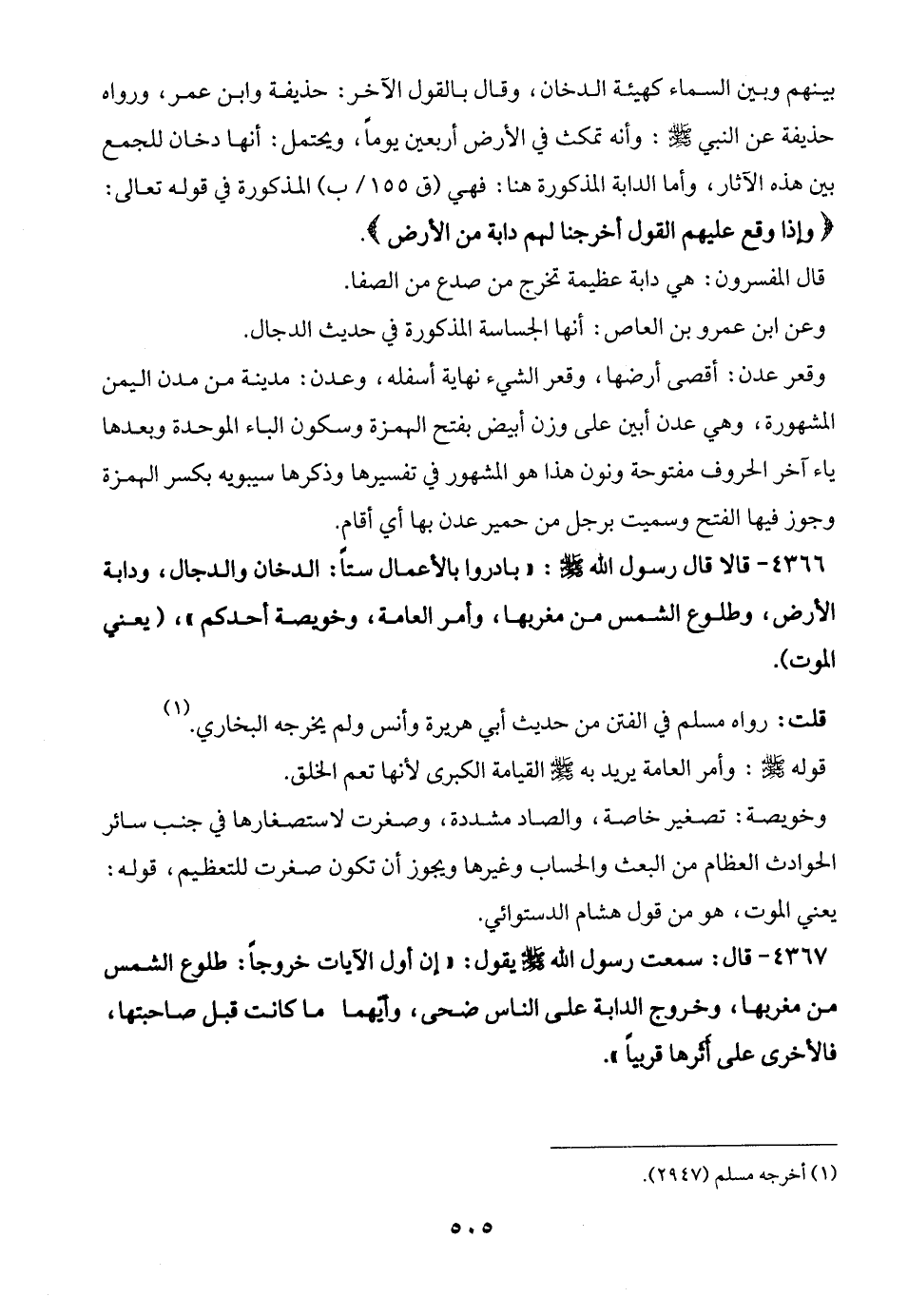 4366 - قالا قال رسول الله - صلى الله عليه وسلم -: "بادروا بالأعمال ستًّا: الدخان والدجال، ودابة الأرض، وطلوع الشمس من مغربها، وأمر العامة، وخويصة أحدكم"، (يعني الموت).