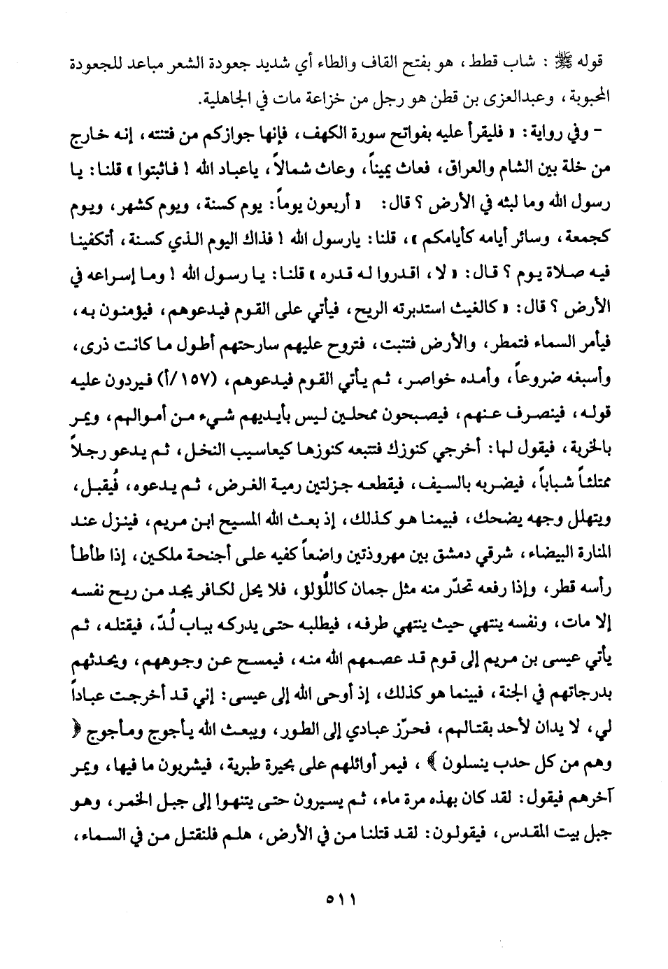 - وفي رواية: "فليقرأ عليه بفواتح سورة الكهف، فإنها جوازكم من فتنته، إنه خارج من خلة بين الشام والعراق، فعاث يمينًا، وعاث شمالًا، يا عباد الله! فاثبتوا، قلنا: يا رسول الله وما لبثه في الأرض؟ قال: "أربعون يومًا: يوم كسنة، ويوم كشهر، ويوم كجمعة، وسائر أيامه كأيامكم"، قلنا: يا رسول الله! فذاك اليوم الذي كسنة، أتكفينا فيه صلاة يوم؟ قال: "لا، اقدروا له قدوه" قلنا: يا رسول الله! وما إسراعه في الأرض؟ قال: "كالغيث استدبرته الريح، فيأتي على القوم فيدعوهم، فيؤمنون به، فيأمر السماء فتمطر، والأرض فتنبت، فتروح عليهم سارحتهم أطول ما كانت ذرى، وأسبغه ضروعًا، وأمده خواصر، ثم يأتي القوم فيدعوهم، فيردون عليه قوله، فينصرف عنهم، فيصبحون ممحلين ليس بأيديهم شيء من أموالهم، ويمر بالخربة، فيقول لها: أخرجي كنوزك فتتبعه كنوزها كيعاسيب النخل، ثم يدعو رجلًا ممتلئًا شبابًا، فيضربه بالسيف، فيقطعه جزلتين رمية الغرض، ثم يدعوه، فيُقبل، ويتهلل وجهه يضحك، فبينما هو كذلك، إذ بعث الله المسيح ابن مريم، فينزل عند المنارة البيضاء، شرقي دمشق بين مهروذتين واضعًا كفيه على أجنحة ملكين، إذا طأطأ رأسه قطر، وإذا رفعه تحدّر منه مثل جمان كاللؤلؤ، فلا يحل لكافر يجد من ريح نفسه إلا مات، ونفسه ينتهي حيث ينتهي طرفه، فيطلبه حتى يدركه بباب لُدّ، فيقتله، ثم يأتى عيسى بن مريم إلى قوم قد عصمهم الله منه، فيمسح عن وجوههم، ويحدثهم بدرجاتهم في الجنة، فبينما هو كذلك، إذ أوحى الله إلى عيسى: إني قد أخرجت عبادًا لي، لا يدان لأحد بقتالهم، فحرّز عبادي إلى الطور، ويبعث الله يأجوج ومأجوج {وهم من كل حدب ينسلون}، فيمر أوائلهم على بحيرة طبرية، فيشربون ما فيها، ويمر آخرهم فيقول: لقد كان بهذه مرة ماء، ثم يسيرون حتى ينتهوا إلى جبل الخمر، وهو جبل بيت المقدس، فيقولون: لقد قتلنا من في الأرض، هلم فلنقتل من في السماء،