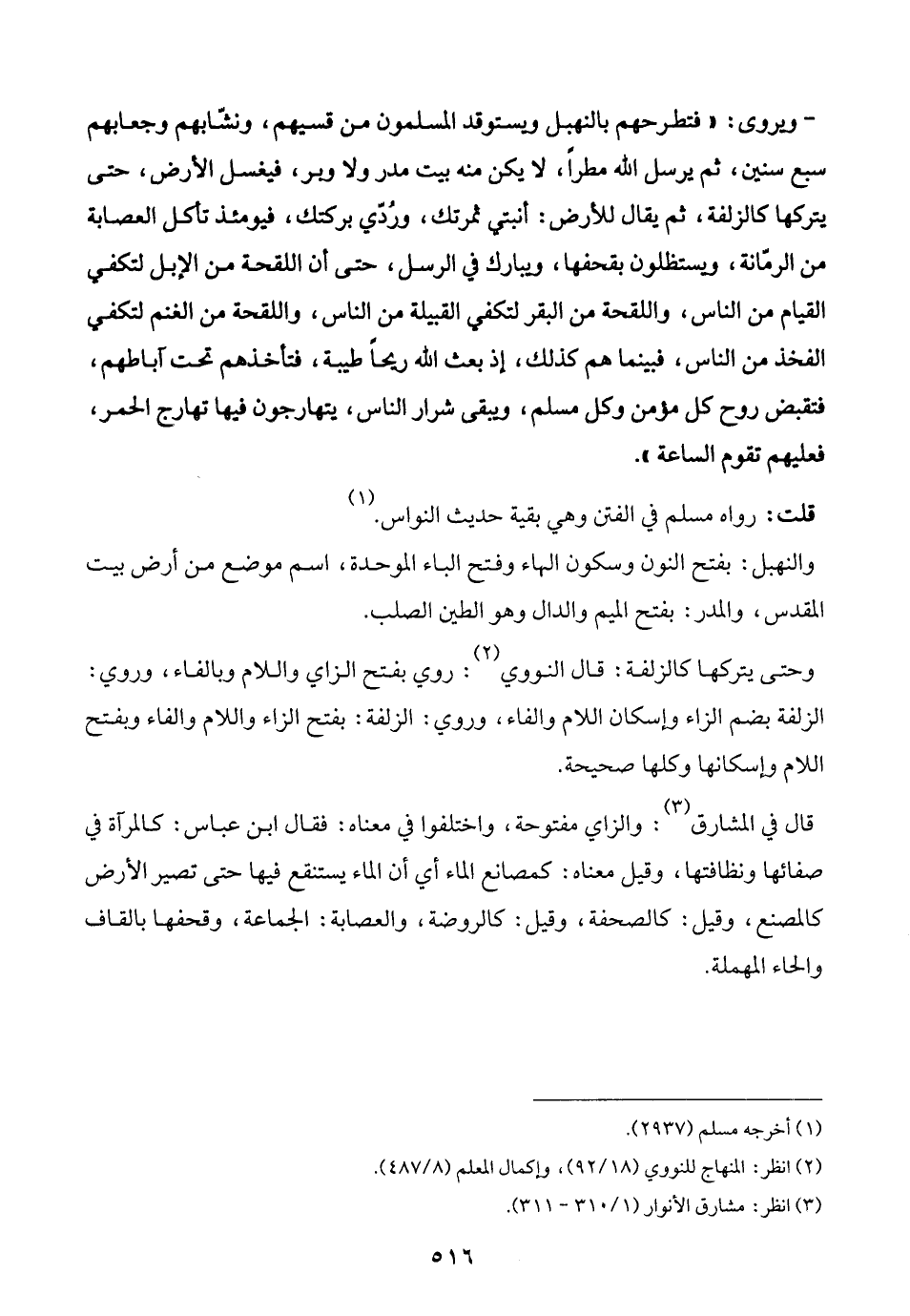 - ويروى: "فتطرحهم بالنهبل ويستوقد المسلمون من قسيهم، ونشّابهم وجعابهم سبع سنين، ثم يرسل الله مطرًا، لا يكن منه بيت مدر ولا وبر، فيغسل الأرض، حتى يتركها كالزلفة، ثم يقال للأرض: أنبتي ثمرتك، ورُدّي بركتك، فيومئذ تأكل العصابة من الرمّانة، ويستظلون بقحفها، ويبارك في الرسل، حتى أن اللقحة من الإبل لتكفي القيام من الناس، واللقحة من البقر لتكفي القبيلة من الناس، واللقحة من الغنم لتكفي الفخذ من الناس، فبينما هم كذلك، إذ بعث الله ريحًا طيبة، فتأخذهم تحت آباطهم، فتقبض روح كل مؤمن وكل مسلم، ويبقى شرار الناس، يتهارجون فيها تهارج الحمر، فعليهم تقوم الساعة".