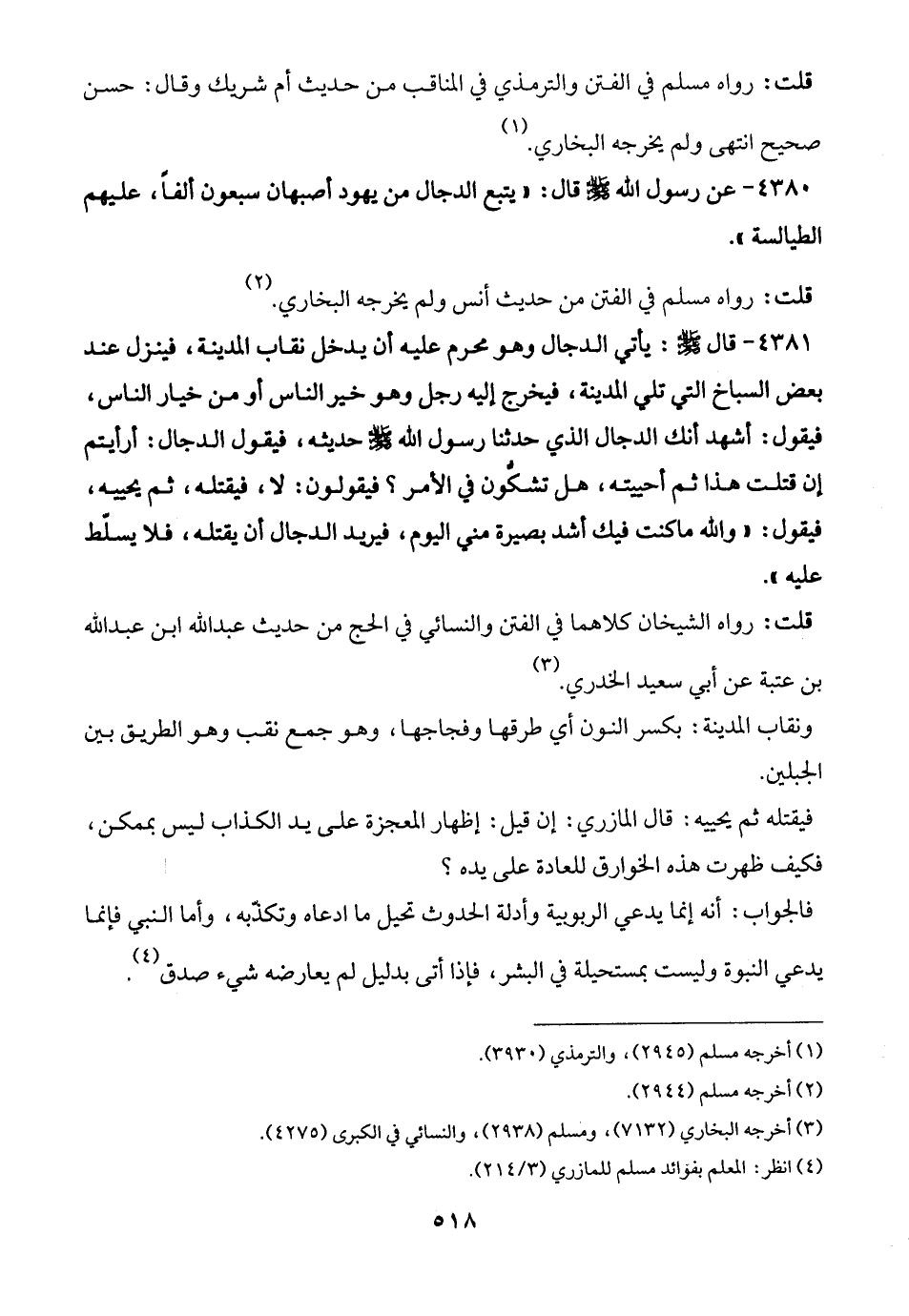 4381 - قال - صلى الله عليه وسلم -: "يأتي الدجال وهو محرم عليه أن يدخل نقاب المدينة، فينزل عند بعض السباخ التي تلي المدينة، فيخرج إليه رجل وهو خير الناس أو من خيار الناس، فيقول: أشهد أنك الدجال الذي حدثنا رسول الله - صلى الله عليه وسلم - حديثه، فيقول الدجال: أرأيتم إن قتلت هذا ثم أحييته، هل تشكُّون في الأمر؟ فيقولون: لا، فيقتله، ثم يحييه، فيقول: "والله ما كنت فيك أشد بصيرة مني اليوم، فيريد الدجال أن يقتله، فلا يسلّط عليه".