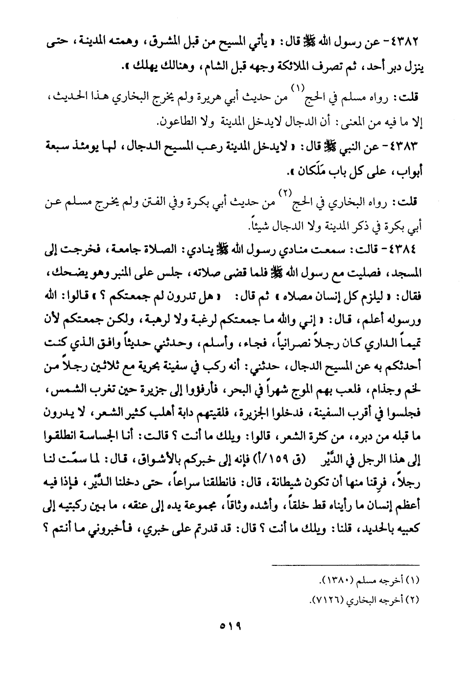 4384 - قالت: سمعت منادي رسول الله - صلى الله عليه وسلم - ينادي: الصلاة جامعة، فخرجت إلى المسجد، فصليت مع رسول الله - صلى الله عليه وسلم - فلما قضى صلاته، جلس على المنبر وهو يضحك، فقال: "ليلزم كل إنسان مصلاه" ثم قال: "هل تدرون لم جمعتكم؟ " قالوا: الله ورسوله أعلم، قال: "إني والله ما جمعتكم لرغبة ولا لرهبة، ولكن جمعتكم لأن تميمًا الداري كان رجلًا نصرانيًّا، فجاء، وأسلم، وحدثني حديثًا وافق الذي كنت أحدثكم به عن المسيح الدجال، حدثني: أنه ركب في سفينة بحرية مع ثلاثين رجلًا من لخم وجذام، فلعب بهم الموج شهرًا في البحر، فأرفؤوا إلى جزيرة حين تغرب الشمس، فجلسوا في أقرب السفينة، فدخلوا الجزيرة، فلقيتهم دابة أهلب كثير الشعر، لا يدرون ما قبله من دبره، من كثرة الشعر، قالوا: ويلك ما أنت؟ قالت: أنا الجساسة انطلقوا إلى هذا الرجل في الدَّيْر فإنه إلى خبركم بالأشواق، قال: لما سمّت لنا رجلًا، فرِقنا منها أن تكون شيطانة، قال: فانطلقنا سراعًا، حتى دخلنا الدير، فإذا فيه أعظم إنسان ما رأيناه قط خلقًا، وأشده وثاقًا، مجموعة يده إلى عنقه، ما بين ركبتيه إلى كعبيه بالحديد، قلنا: ويلك ما أنت؟ قال: قد قدرتم على خبري، فأخبروني ما أنتم؟