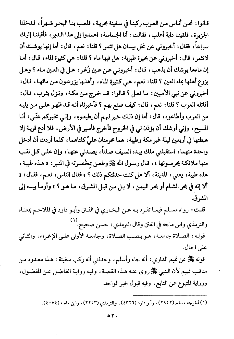 قالوا: نحن أناس من العرب ركبنا في سفينة بحرية، فلعب بنا البحر شهرًا، فدخلنا الجزيرة، فلقيتنا دابة أهلب، فقالت: أنا الجساسة، اعمدوا إلى هذا الدير، فأقبلنا إليك سراعًا، فقال: أخبروني عن نخل بيسان هل تثمر؟ قلنا: نعم، قال: أما إنها يوشك أن لا تثمر، قال: أخبروني عن بحيرة طبرية: هل فيها ماء؟ قلنا: هي كثيرة الماء، قال: أما إن ماءها يوشك أن يذهب، قال: أخبروني عن عين زُغر: هل في العين ماء؟ وهل يزرع أهلها بماء العين؟ قلنا: نعم، هي كثيرة الماء، وأهلها يزرعون من مائها، قال: أخبروني عن نبي الأميين: ما فعل؟ قالوا: قد خرج من مكة، ونزل يثرب، قال: أقاتله العرب؟ قلنا: نعم، قال: كيف صنع بهم؟ فأخبرناه أنه قد ظهر على من يليه من العرب وأطاعوه، قال: أما إن ذلك خير لهم أن يطيعوه، وإني مخبركم عني: أنا المسيح، وإني أوشك أن يؤذن لي في الخروج فأخرج فأسير في الأرض، فلا أدع قرية إلا هبطتها في أربعين ليلة غير مكة وطيبة، هما محرمتان عليّ كلتاهما، كلما أردت أن أدخل واحدة منهما، استقبلني ملك بيده السيف صلتًا، يصدني عنها، وإن على كل نقب منها ملائكة يحرسونها"، قال رسول الله - صلى الله عليه وسلم - وطعن بمِخْصرته في المنبر: "هذه طيبة، هذه طيبة، يعني: المدينة، ألا هل كنت حدثتكم ذلك؟ " فقال الناس: نعم، فقال: "ألا إنه في بحر الشام أو بحر اليمن، لا بل من قبل المشرق، ما هو؟ " وأومأ بيده إلى المشرق.