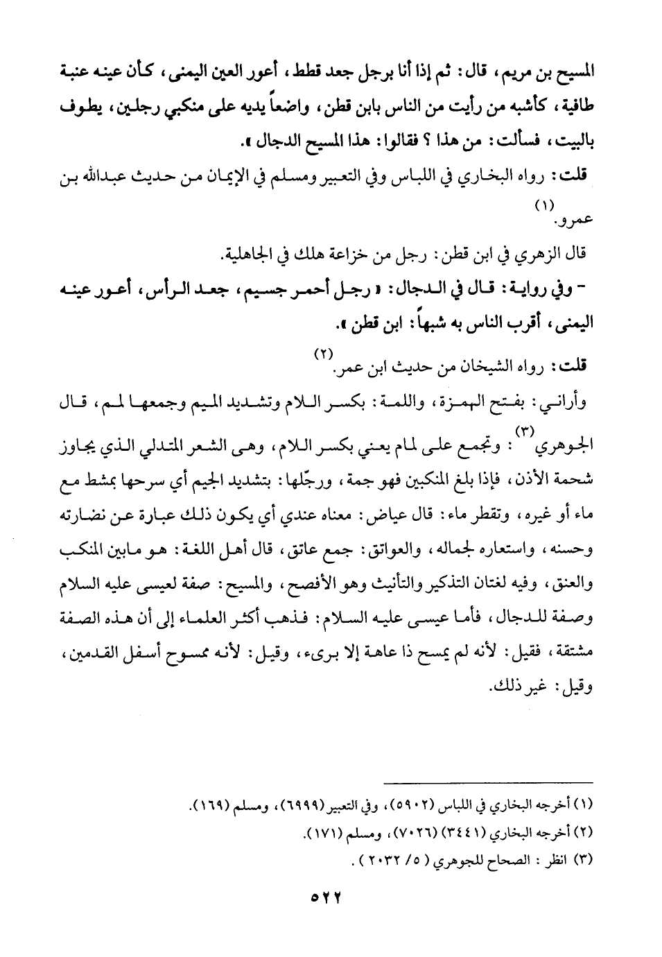 المسيح بن مريم، قال: ثم إذا أنا برجل جعد قطط، أعور العين اليمنى، كأن عينه عنبة طافية، كأشبه من رأيت من الناس بابن قطن، واضعًا يديه على منكبي رجلين، يطوف بالبيت، فسألت: من هذا؟ فقالوا: هذا المسيح الدجال".