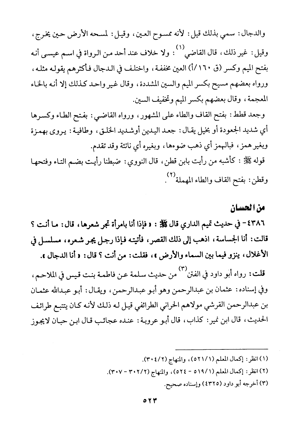 4386 - في حديث تميم الداري قال - صلى الله عليه وسلم -: "فإذا أنا بامرأة تجر شعرها، قال: ما أنت؟ قالت: أنا الجساسة، اذهب إلى ذلك القصر، فأتيته فإذا رجل يجر شعره، مسلسل في الأغلال، ينزو فيما بين السماء والأرض"، فقلت: من أنت؟ قال: "أنا الدجال".