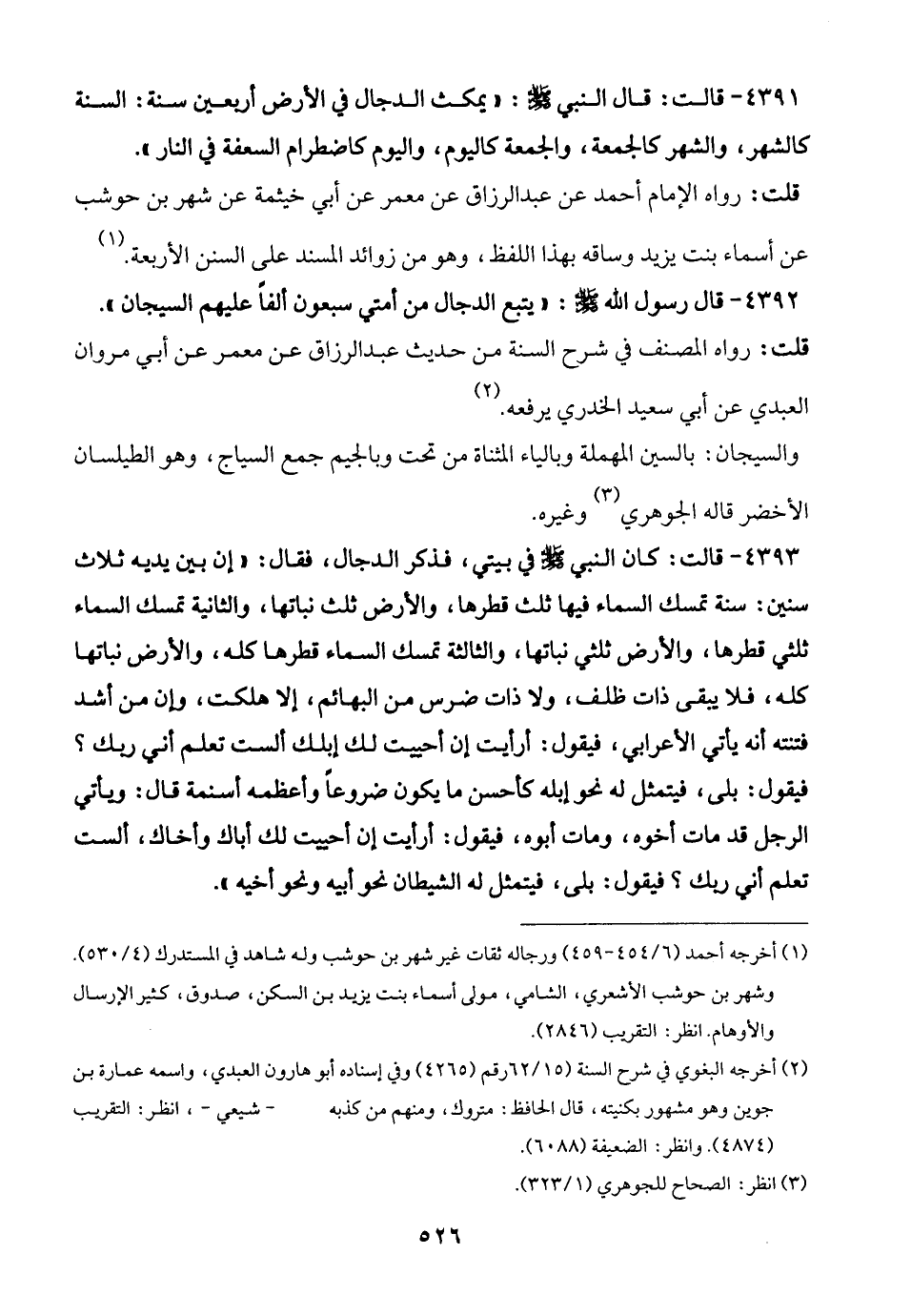 4393 - قالت: كان النبي - صلى الله عليه وسلم - في بيتي، فذكر الدجال، فقال: "إن بين يديه ثلاث سنين: سنة تمسك السماء فيها ثلث قطرها، والأرض ثلث نباتها، والثانية تمسك السماء ثلثي قطرها، والأرض ثلثي نباتها، والثالثة تمسك السماء قطرها كله، والأرض نباتها كله، فلا يبقى ذات ظلف، ولا ذات ضرس من البهائم، إلا هلكت، وإن من أشد فتنته أنه يأتي الأعرابي، فيقول: أرأيت إن أحييت لك إبلك ألست تعلم أني ربك؟ فيقول: بلى، فيتمثل له نحو إبله كأحسن ما يكون ضروعًا وأعظمه أسنمة قال: ويأتي الرجل قد مات أخوه، ومات أبوه، فيقول: أرأيت إن أحييت لك أباك وأخاك، ألست تعلم أني ربك؟ فيقول: بلى، فيتمثل له الشيطان نحو أبيه ونحو أخيه".