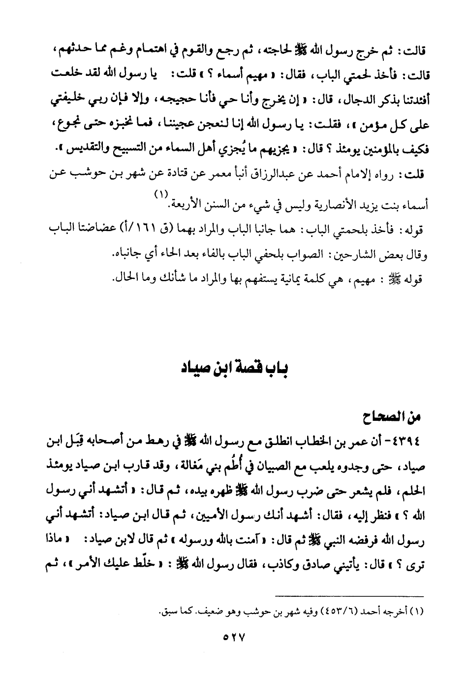 قلت: رواه الإمام أحمد عن عبد الرزاق أنبأ معمر عن قتادة عن شهر بن حوشب عن أسماء بنت يزيد الأنصارية وليس في شيء من السنن الأربعة. (¬1)
