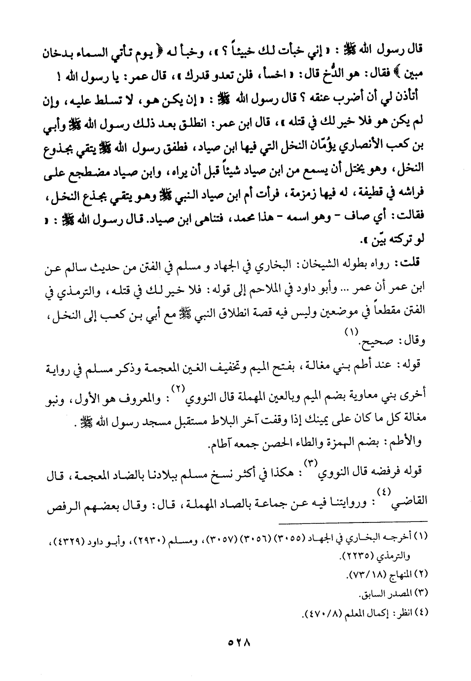 قلت: رواه بطوله الشيخان: البخاري في الجهاد ومسلم في الفتن من حديث سالم عن ابن عمر أن عمر ... وأبو داود في الملاحم إلى قوله: فلا خير لك في قتله، والترمذي في الفتن مقطعًا في موضعين وليس فيه قصة انطلاق النبي - صلى الله عليه وسلم - مع أبي بن كعب إلى النخل وقال: صحيح. (¬1)