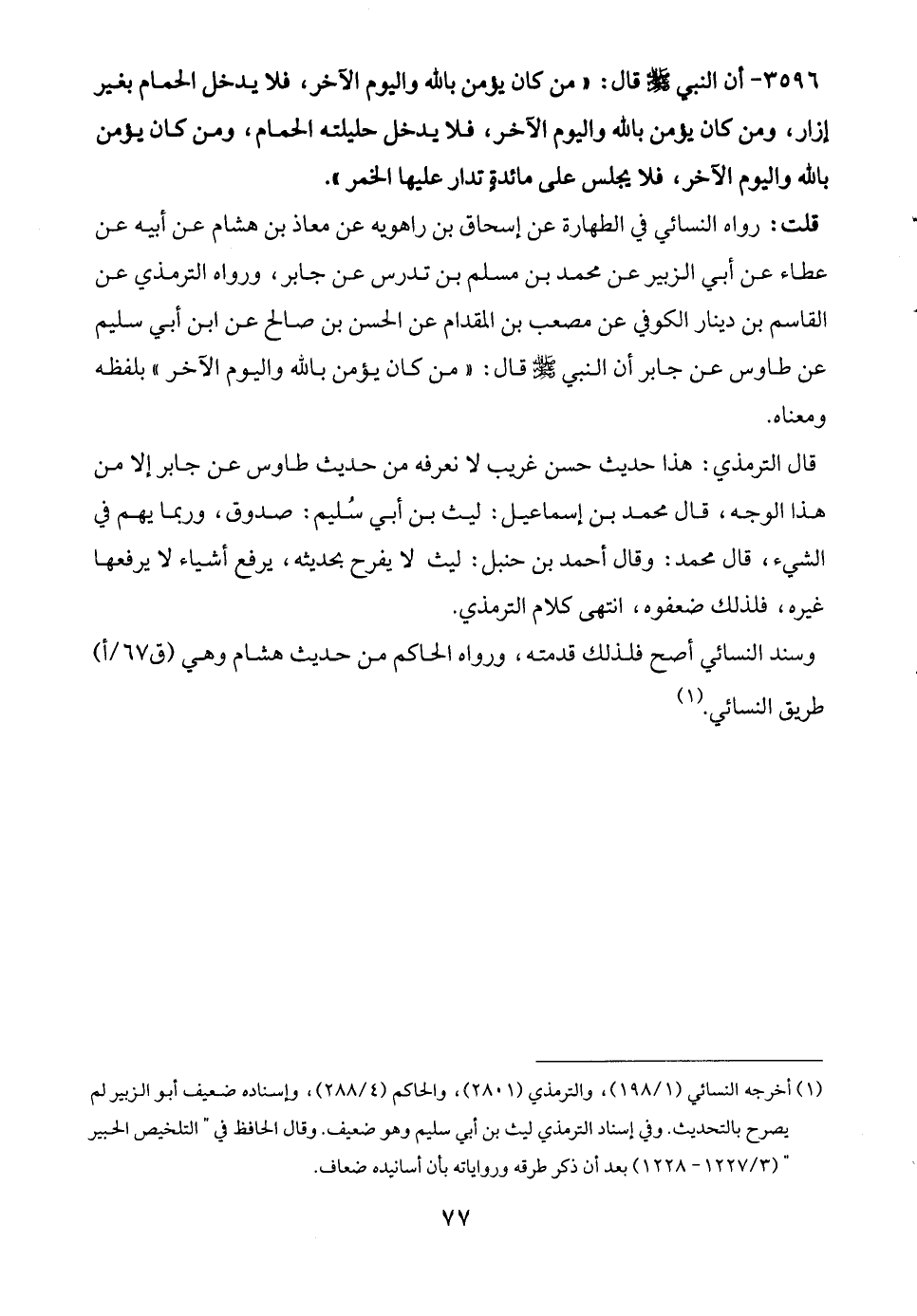 3596 - أن النبي - صلى الله عليه وسلم - قال: "من كان يؤمن بالله واليوم الآخر، فلا يدخل الحمام بغير إزار، ومن كان يؤمن بالله واليوم الآخر، فلا يدخل حليلته الحمام، ومن كان يؤمن بالله واليوم الآخر، فلا يجلس على مائدة تدار عليها الخمر".