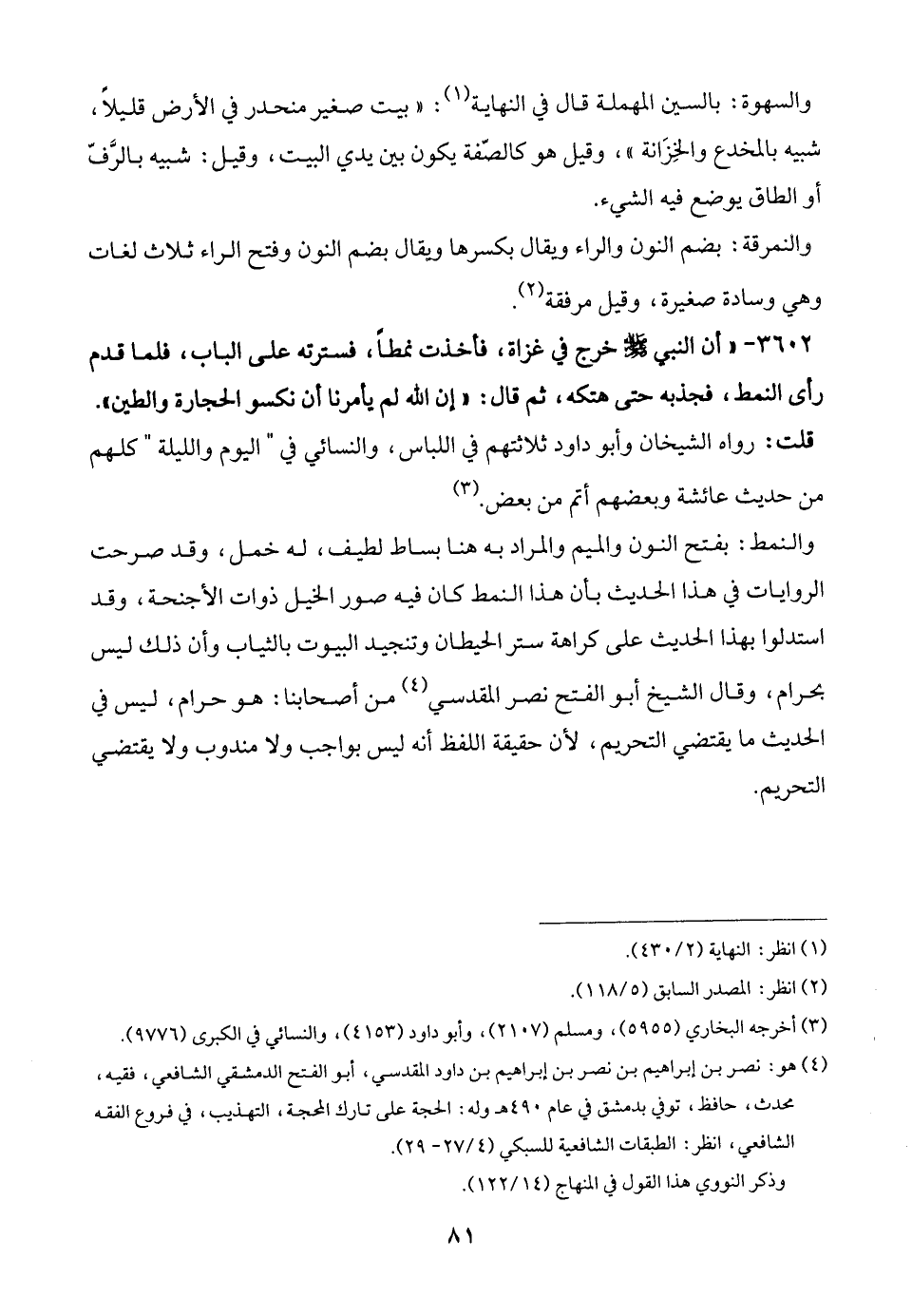 3602 - "أن النبي - صلى الله عليه وسلم - خرج في غزاة، فأخذت نمطًا، فسترته على الباب، فلما قدم رأى النمط، فجذبه حتى هتكه، ثم قال: "إن الله لم يأمرنا أن نكسو الحجارة والطين".