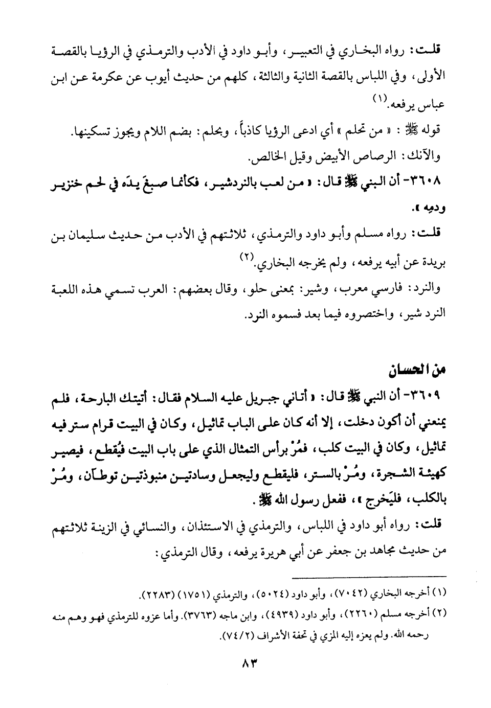3609 - أن النبي - صلى الله عليه وسلم - قال: "أتاني جبريل عليه السلام فقال: أتيتك البارحة، فلم يمنعني أن أكون دخلت، إلا أنه كان على الباب تماثيل، وكان في البيت قرام ستر فيه تماثيل، وكان في البيت كلب، فمُرْ برأس التمثال الذي على باب البيت فيُقطع، فيصير كهيئة الشجرة، ومُرْ بالستر، فليقطع وليجعل وسادتين منبوذتين توطآن، ومُرْ بالكلب، فليَخرج"، ففعل رسول الله - صلى الله عليه وسلم -.