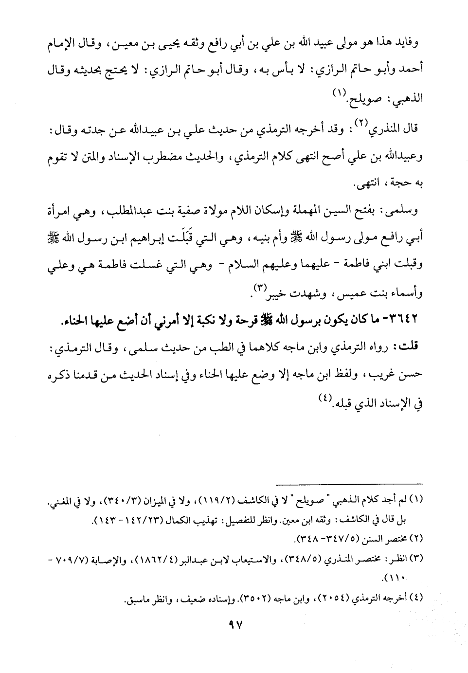 قلت: رواه الترمذي وابن ماجه كلاهما في الطب من حديث سلمى، وقال الترمذي: حسن غريب، ولفظ ابن ماجه إلا وضع عليها الحناء وفي إسناد الحديث من قدمنا ذكره في الإسناد الذي قبله. (¬4)
