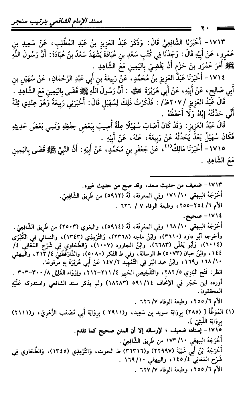 1713 - أَخْبَرَنَا الشَّافِعِيُّ قَالَ: وَذَكَرَ عَبْدُ الْعَزِيزِ بْنُ عَبْدِ الْمُطَّلِبِ، عَنْ سَعِيدِ بْنِ عَمْرٍو، عَنْ أَبِيهِ قَالَ: وَجَدْنَا فِي كُتُبِ سَعْدِ بْنِ عُبَادَةَ يَشْهَدُ سَعْدُ بْنُ عُبَادَةَ: أَنَّ رَسُولَ اللَّهِ صَلَّى اللَّهُ عَلَيْهِ وَسَلَّمَ أَمَرَ عَمْرَو بْنَ حَزْمٍ أَنْ يَقْضِيَ بِالْيَمِينِ مَعَ الشَّاهِدِ.