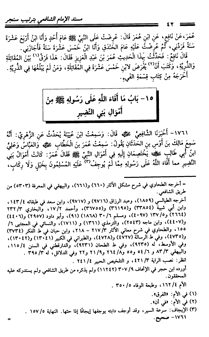 1761 - أَخْبَرَنَا الشَّافِعِيُّ رَضِيَ اللَّهُ عَنْهُ، قَالَ: وَسَمِعْتُ ابْنَ عُيَيْنَةَ يُحَدِّثُ، عَنِ الزُّهْرِيِّ: أَنَّهُ سَمِعَ مَالِكَ بْنَ أَوْسِ بْنِ الْحَدَثَانِ، يَقُولُ: سَمِعْتُ عُمَرَ بْنَ الْخَطَّابِ رَضِيَ اللَّهُ عَنْهُ، وَالْعَبَّاسَ، وَعَلِيَّ بْنَ أَبِي طَالِبٍ رَضِيَ اللَّهُ عَنْهُمَا يَخْتَصِمَانِ إِلَيْهِ فِي أَمْوَالِ النَّبِيِّ صَلَّى اللَّهُ عَلَيْهِ وَسَلَّمَ، فَقَالَ عُمَرُ: كَانَتْ أَمْوَالُ بَنِي النَّضِيرِ مِمَّا أَفَاءَ اللَّهُ عَلَى رَسُولِهِ مِمَّا لَمْ يُوجِفْ عَلَيْهِ الْمُسْلِمُونَ بِخَيْلٍ وَلا رِكَابٍ،