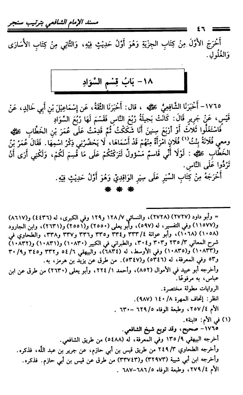 1765 - أَخْبَرَنَا الشَّافِعِيُّ رَضِيَ اللَّهُ عَنْهُ، قَالَ: أَخْبَرَنَا الثِّقَةُ، عَنْ إِسْمَاعِيلَ بْنِ أَبِي خَالِدٍ، عَنْ قَيْسٍ، عَنْ جَرِيرٍ، قَالَ: كَانَتْ بَجِيلَةُ رُبُعَ النَّاسِ، فَقَسَّمَ لَهَا رُبُعَ السَّوَادِ.