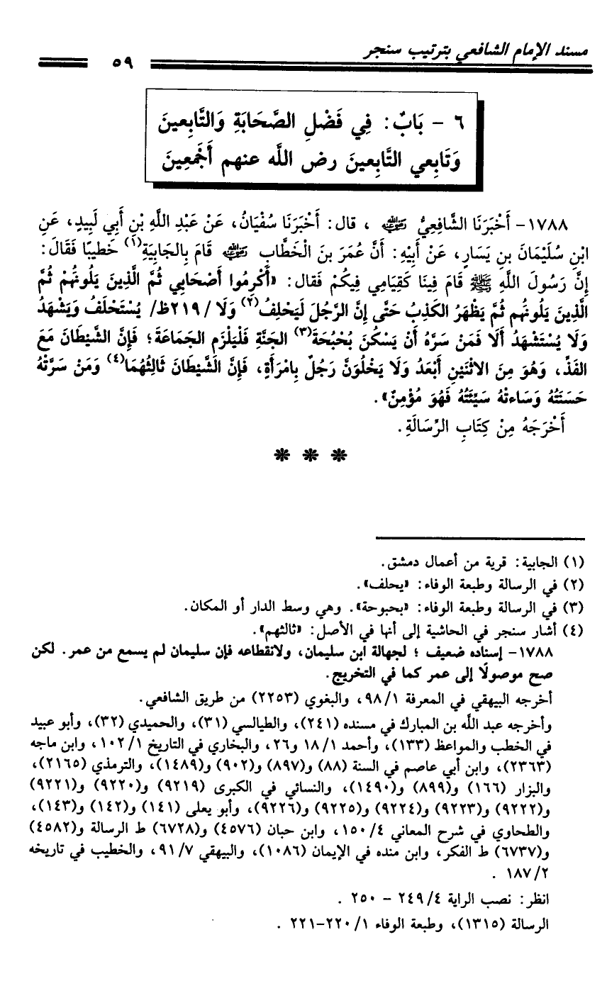 1788 - أَخْبَرَنَا الشَّافِعِيُّ رَضِيَ اللَّهُ عَنْهُ، قَالَ: أَخْبَرَنَا سُفْيَانُ، عَنْ عَبْدِ اللَّهِ بْنِ أَبِي لَبِيدٍ، عَنِ ابْنِ سُلَيْمَانَ بْنِ يَسَارٍ، عَنْ أَبِيهِ: أَنَّ عُمَرَ بْنِ الْخَطَّابِ رَضِيَ اللَّهُ عَنْهُ قَامَ بِالْجَابِيَةِ خَطِيبًا، فَقَالَ: إِنَّ رَسُولَ اللَّهِ صَلَّى اللَّهُ عَلَيْهِ وَسَلَّمَ قَامَ فِينَا كَقِيَامِي فِيكُمْ، فَقَالَ: «أَكْرِمُوا أَصْحَابِي ثُمَّ الَّذِينَ يَلُونَهُمْ ثُمَّ الَّذِينَ يَلُونَهُمْ ثُمَّ يَظْهَرُ الْكَذِبُ حَتَّى إِنَّ الرَّجُلَ لَيَحْلِفُ وَلا يُسْتَحْلَفُ وَيَشْهَدُ وَلا يُسْتَشْهَدُ أَلا فَمَنْ سَرَّهُ أَنْ يَسْكُنَ بُحْبُوحَةَ الْجَنَّةِ فَلْيَلْزَمِ الْجَمَاعَةَ؛ فَإِنَّ الشَّيْطَانَ مَعَ الْفَذِّ، وَهُوَ مِنَ الاثْنَيْنِ أَبْعَدُ وَلا يَخْلُوَنَّ رَجُلٌ بِامْرَأَةٍ، فَإِنَّ الشَّيْطَانَ ثَالِثُهُمَا وَمَنْ سَرَّتْهُ حَسَنَتُهُ وَسَاءَتْهُ سَيِّئَتُهُ فَهُوَ مُؤْمِنٌ» .