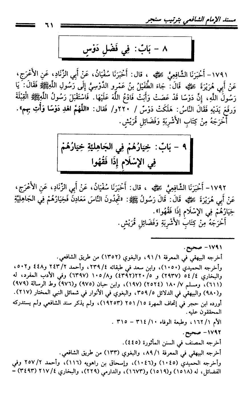 1791 - أَخْبَرَنَا الشَّافِعِيُّ رَضِيَ اللَّهُ عَنْهُ، قَالَ: أَخْبَرَنَا سُفْيَانُ، عَنْ أَبِي الزِّنَادِ، عَنِ الأَعْرَجِ، عَنْ أَبِي هُرَيْرَةَ رَضِيَ اللَّهُ عَنْهُ قَالَ: جَاءَ الطُّفَيْلُ بْنُ عَمْرٍو الدَّوْسِيُّ إِلَى رَسُولِ اللَّهِ صَلَّى اللَّهُ عَلَيْهِ وَسَلَّمَ، فَقَالَ: يَا رَسُولَ اللَّهِ، إِنَّ دَوْسًا قَدْ عَصَتْ وَأَبَتْ فَادْعُ اللَّهَ عَلَيْهَا.