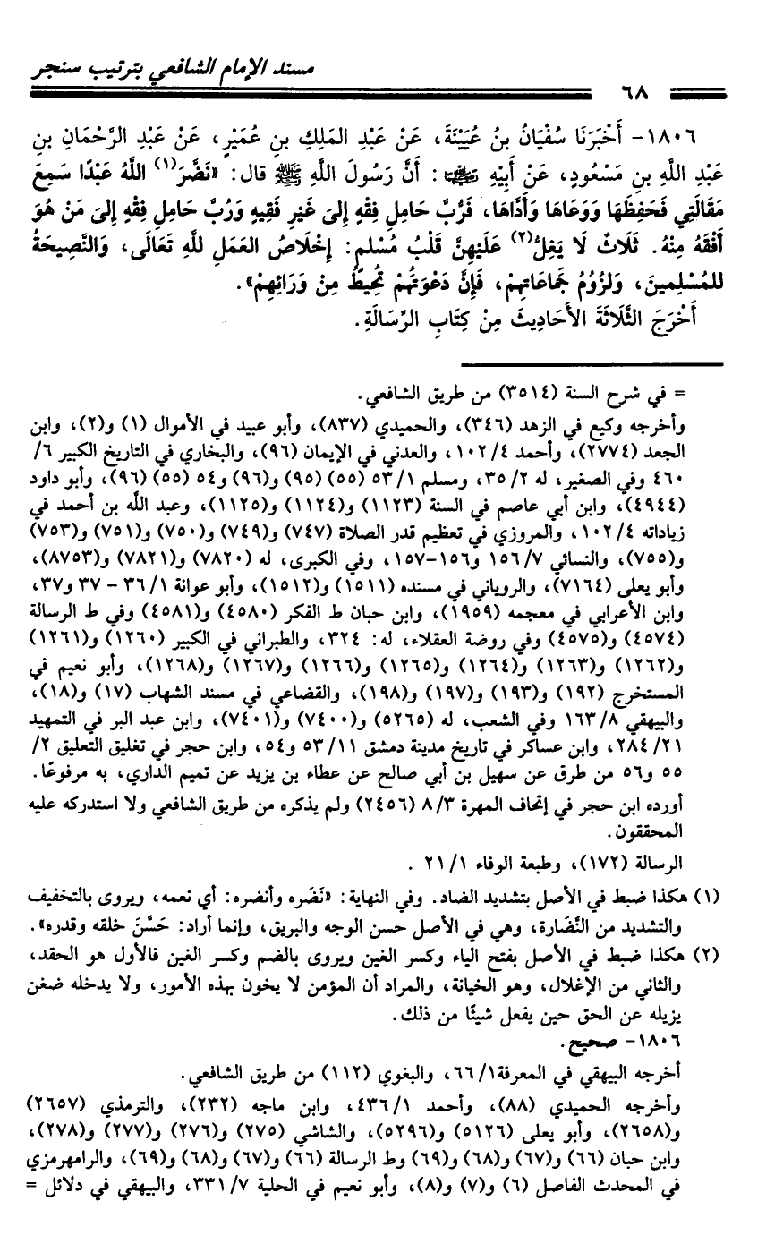1806 - أَخْبَرَنَا سُفْيَانُ بْنُ عُيَيْنَةَ، عَنْ عَبْدِ الْمَلِكِ بْنِ عُمَيْرٍ، عَنْ عَبْدِ الرَّحْمَنِ بْنِ عَبْدِ اللَّهِ بْنِ مَسْعُودٍ، عَنْ أَبِيهِ رَضِيَ اللَّهُ عَنْهُمَا: أَنَّ رَسُولَ اللَّهِ صَلَّى اللَّهُ عَلَيْهِ وَسَلَّمَ قَالَ: " نَضَّرَ اللَّهُ عَبْدًا سَمِعَ مَقَالَتِي فَحَفِظَهَا وَوَعَاهَا وَأَدَّاهَا، فَرُبَّ حَامِلِ فِقْهٍ إِلَى غَيْرِ فَقِيهٍ وَرُبَّ حَامِلِ فِقْهٍ إِلَى مَنْ هُوَ أَفْقَهُ مِنْهُ.