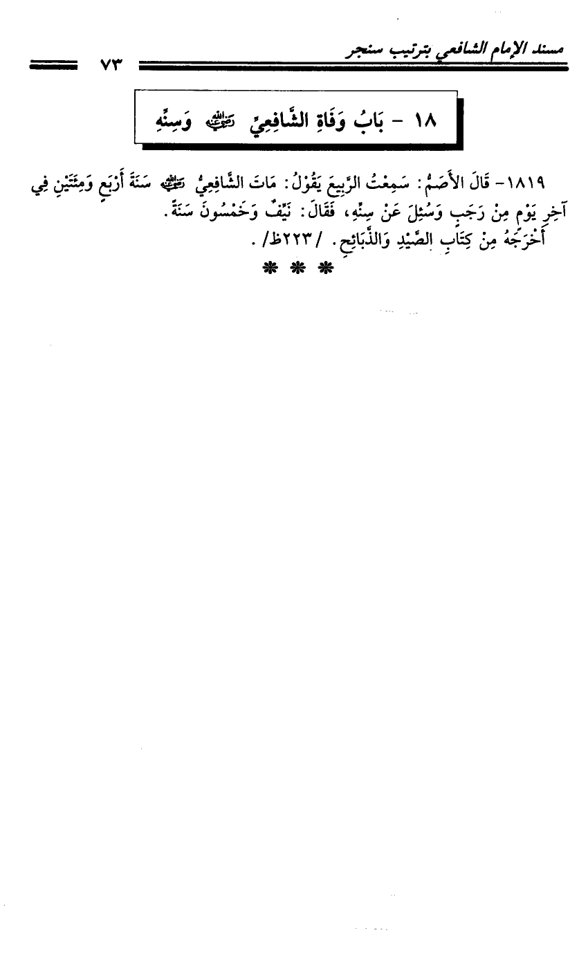 1819 - قَالَ الأَصَمُّ: سَمِعْتُ الرَّبِيعَ يَقُولُ: مَاتَ الشَّافِعِيُّ رَضِيَ اللَّهُ عَنْهُ سَنَةَ أَرْبَعٍ وَمِائَتَيْنِ فِي آخِرِ يَوْمٍ مِنْ رَجَبٍ، وَسُئِلَ عَنْ سِنِّهِ، فَقَالَ: نَيِّفٌ وَخَمْسُونَ سَنَةً.