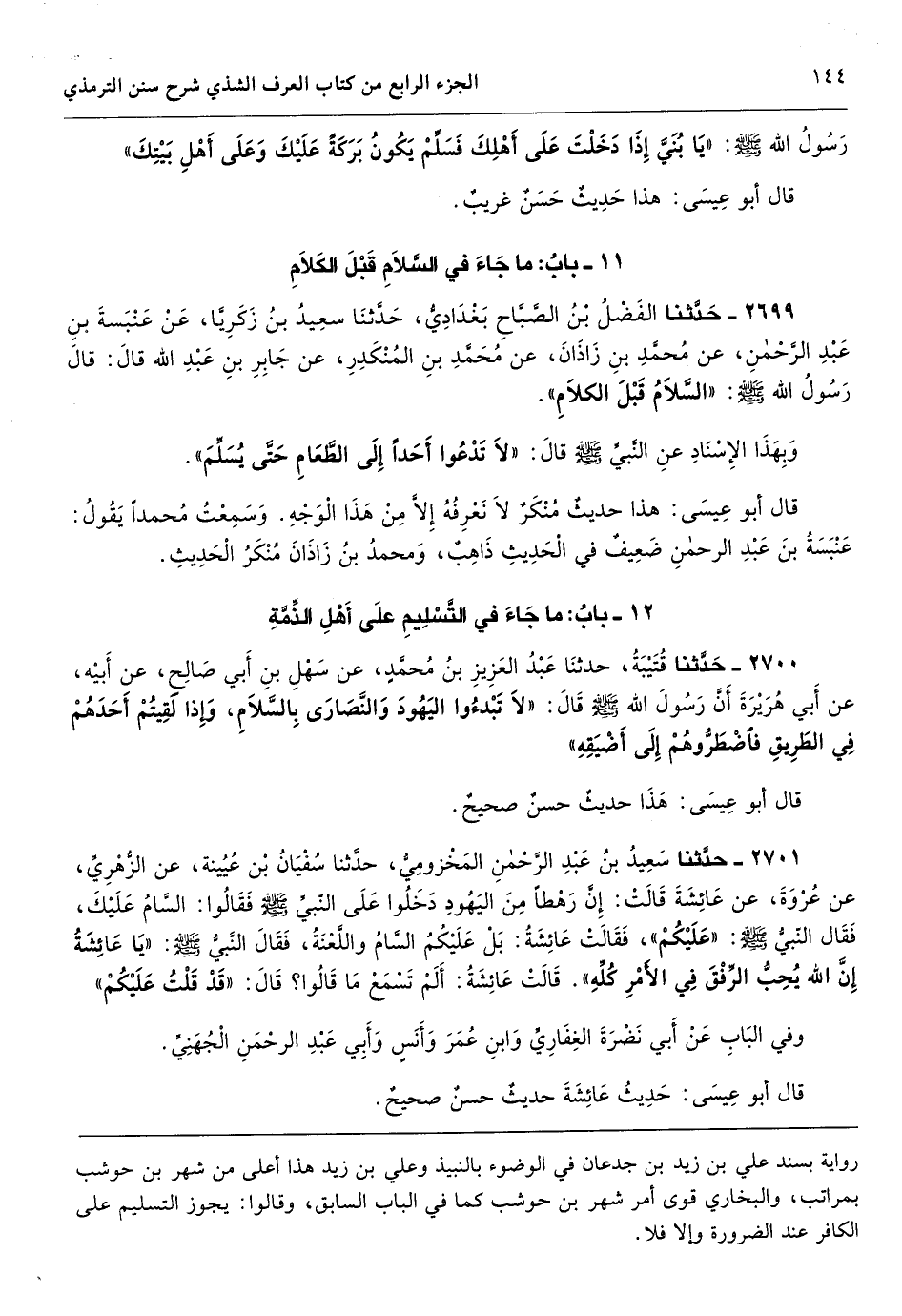 رواية بسند علي بن زيد بن جدعان في الوضوء بالنبيذ وعلي بن زيد هذا أعلى من شهر بن حوشب بمراتب، والبخاري قوى أمر شهر بن حوشب كما في الباب السابق، وقالوا: يجوز التسليم على الكافر عند الضرورة وإلا فلا.
