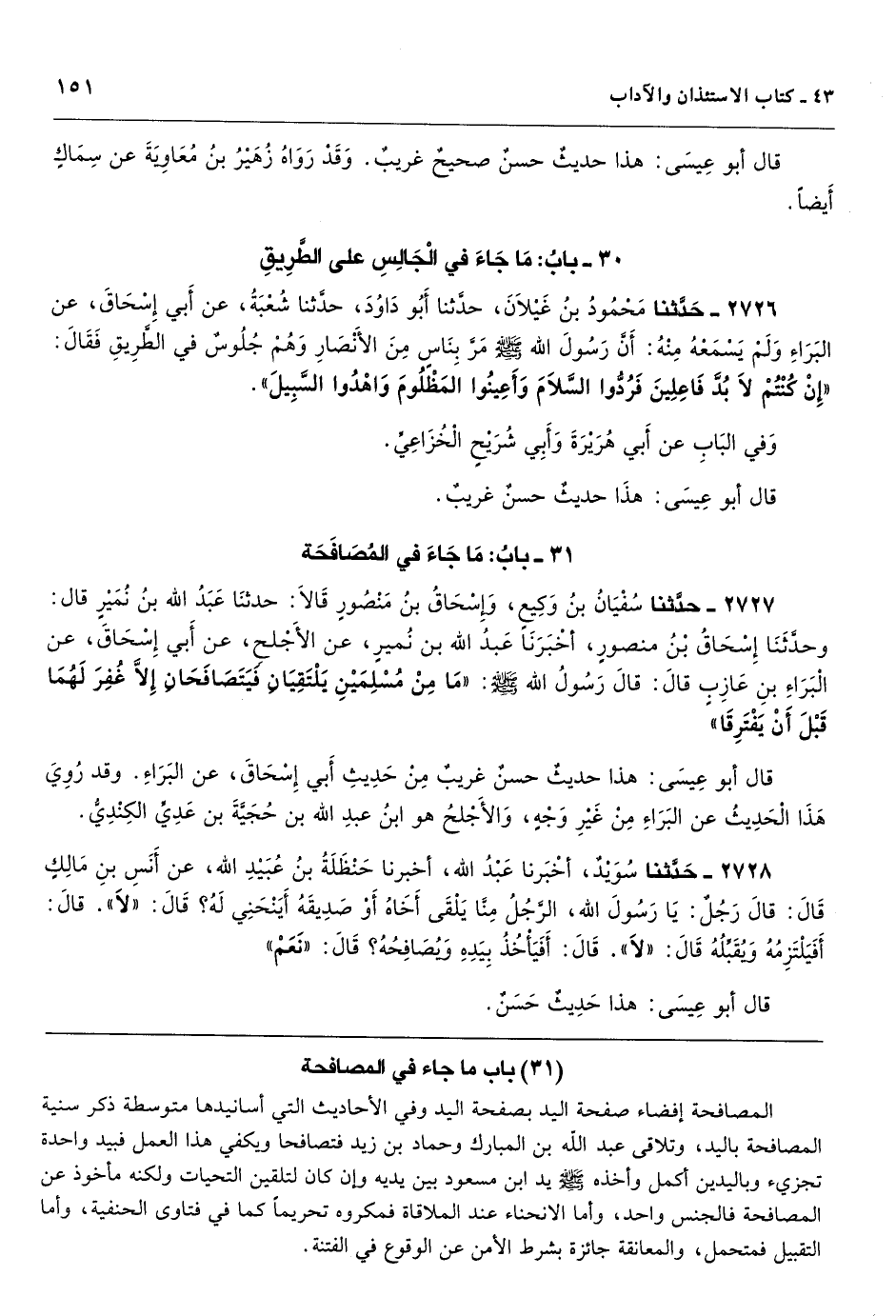[2727] المصافحة إفضاء صفحة اليد بصفحة اليد وفي الأحاديث التي أسانيدها متوسطة ذكر سنية المصافحة باليد، وتلاقى عبد الله بن المبارك وحماد بن زيد فتصافحا ويكفي هذا العمل فبيد واحدة تجزيء وباليدين أكمل وأخذه - صَلَّى اللهُ عَلَيْهِ وَسَلَّمَ - يد ابن مسعود بين يديه وإن كان لتلقين التحيات ولكنه مأخوذ عن المصافحة فالجنس واحد، وأما الانحناء عند الملاقاة فمكروه تحريماً كما في فتاوى الحنفية، وأما التقبيل فمتحمل، والمعانقة جائزة بشرط الأمن عن الوقوع في الفتنة.