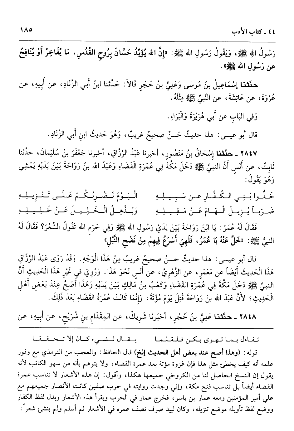 قوله: (وهذا أصح عند بعض أهل الحديث إلخ) قال الحافظ: والعجب من الترمذي مع وفور علمه أنه كيف يخطئ مثل هذا فإن غزوة مؤتة بعد عمرة القضاء، ولا يتوهم بأنه من سهو الكاتب لأنه يقول إن النسخ الحاصل لنا من الكروخي جميعها هكذا، وأقول: إن هذه الأشعار لا تناسب عمرة القضاء أيضاً بل تناسب فتح مكة، وإني وجدت روايته في حرب صفين كانت الأنصار جميعهم مع علي أمير المؤمنين ومعه عمار بن ياسر، فخرج عمار في الحرب ويقرأ هذه الأشعار وبدل لفظ الكفار ووضع لفظ تأويله موضع تنزيله، وكان لبيد صرف نصف عمره في الأشعار ثم أسلم ولم ينشئ شعراً: