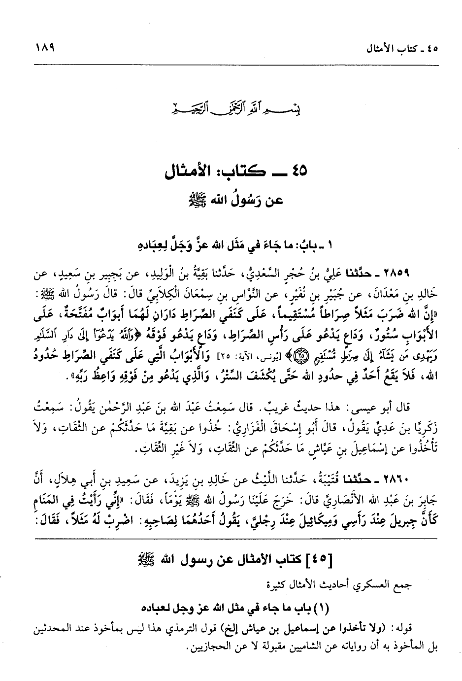 [2859] قوله: (ولا تأخذوا عن إسماعيل بن عياش إلخ) قول الترمذي هذا ليس بمأخوذ عند المحدثين بل المأخوذ به أن رواياته عن الشاميين مقبولة لا عن الحجازيين.