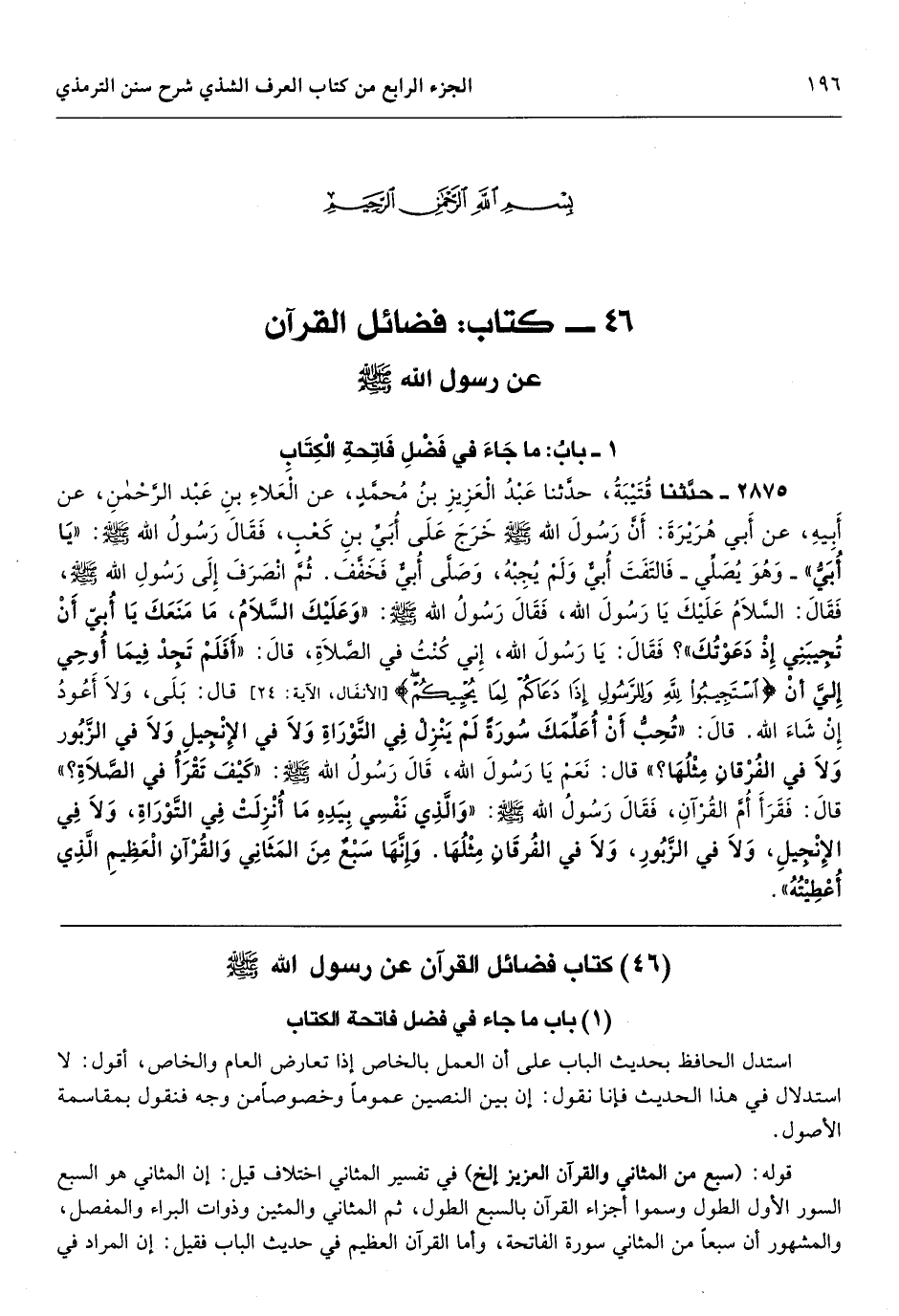قوله: (سبع من المثاني والقرآن العزيز إلخ) في تفسير المثاني اختلاف قيل: إن المثاني هو السبع السور الأول الطول وسموا أجزاء القرآن بالسبع الطول، ثم المثاني والمئين وذوات البراء والمفصل، والمشهور أن سبعاً من المثاني سورة الفاتحة، وأما القرآن العظيم في حديث الباب فقيل: إن المراد في