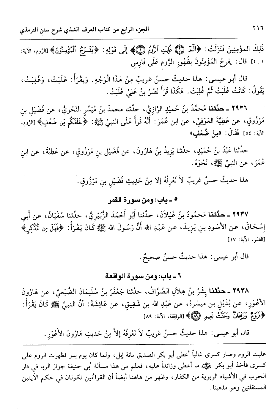 غلبت الروم وصار كسرى غالباً أعطى أبو بكر الصديق مائة إبل، ولما كان يوم بدر فظهرت الروم على كسرى فأخذ أبو بكر ما أعطى وزائداً عليه، فعلم من هذا مسألة أبي حنيفة جواز الربا في دار الحرب في الأشياء الربوية من الكفار، وظهر من هاهنا أيضاً أن القراأتين تكونان في حكم الآيتين المستقلتين وهو مذهبنا.