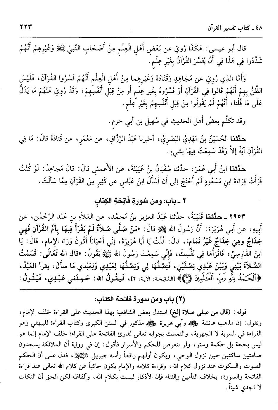 [2953] قوله: (قال من صلى صلاة إلخ) استدل بعض الشافعية بهذا الحديث على القراءة خلف الإمام، ونقول: إن مذهب عائشة وأبي هريرة مذكور في السنن الكبرى وكتاب القراءة للبيهقي وهو القراءة في السرية لا الجهرية، والتمسك بجوابه تعالى لقارئ الفاتحة على القراءة خلف الإمام إنما هو ليس بحجة بل حكمة وستر، ولو نتعرض للحكم والأسرار فأقول: إن في رواية أن الملائكة يسجدون صامتين ساكتين حين نزول الوحي، ويكون أولهم رافعاً رأسه جبريل، فدل على أن الحكم الصوت والسكوت عند نزول كلام الله، وقراءة كلامه والإمام يكون حاكياً عن كلام الله تعالى عند قراءة الفاتحة والسورة، بخلاف التأمين والثناء فإن الأذكار ليست بكلام الله، وألفاظه لكن الحق أن النكات لا تجدي شيئاً.
