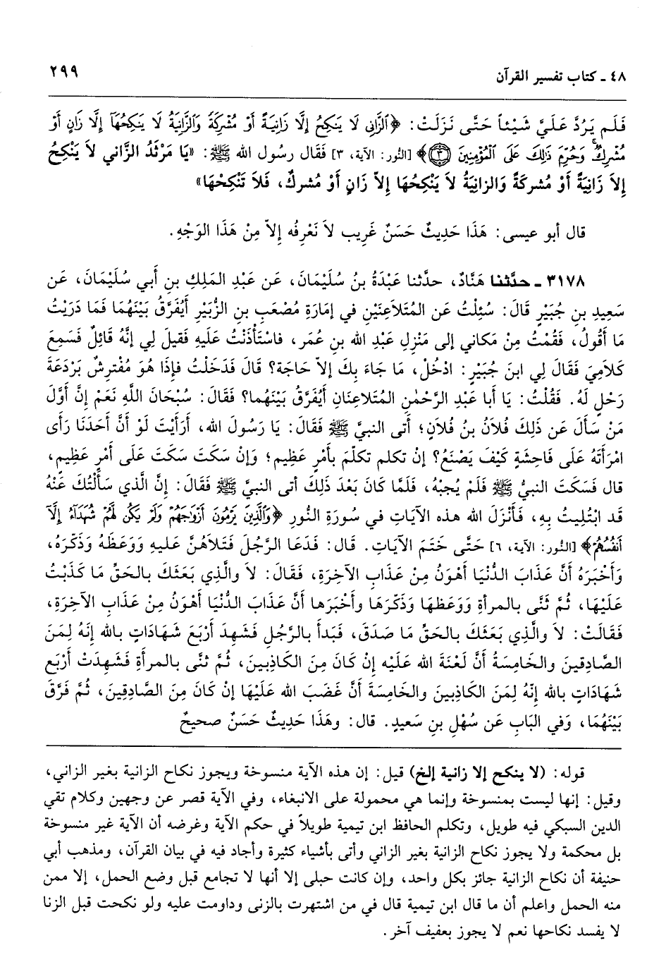 [3177] قوله: (لا ينكح إلا زانية إلخ) قيل: إن هذه الآية منسوخة ويجوز نكاح الزانية بغير الزاني، وقيل: إنها ليست بمنسوخة وإنما هي محمولة على الانبغاء، وفي الآية قصر عن وجهين وكلام تقي الدين السبكي فيه طويل، وتكلم الحافظ ابن تيمية طويلاً في حكم الآية وغرضه أن الآية غير منسوخة بل محكمة ولا يجوز نكاح الزانية بغير الزاني وأتى بأشياء كثيرة وأجاد فيه في بيان القرآن، ومذهب أبي حنيفة أن نكاح الزانية جائز بكل واحد، وإن كانت حبلى إلا أنها لا تجامع قبل وضع الحمل، إلا ممن منه الحمل واعلم أن ما قال ابن تيمية قال في من اشتهرت بالزنى وداومت عليه ولو نكحت قبل الزنا لا يفسد نكاحها نعم لا يجوز بعفيف آخر.