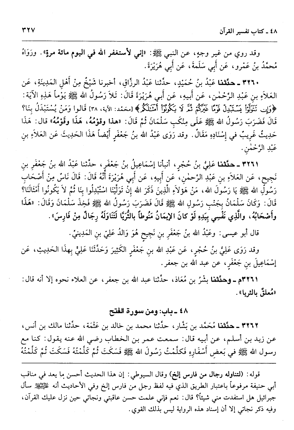 [3259] قوله: (لتناوله رجال من فارس إلخ) وقال السيوطي: إن هذا الحديث أحسن ما يعد في مناقب أبي حنيفة مرفوعاً باعتبار الطريق الذي فيه لفظ رجل من فارس إلخ وفي الأحاديث أنه سأل جبرائيل هل استفدت مني شيئاً؟ قال: نعم فإني علمت حسن عاقبتي ونجاتي حين نزل عليك القرآن، وفيه ذكر نجاتي إلا أن إسناد هذه الرواية ليس بذلك القوي.