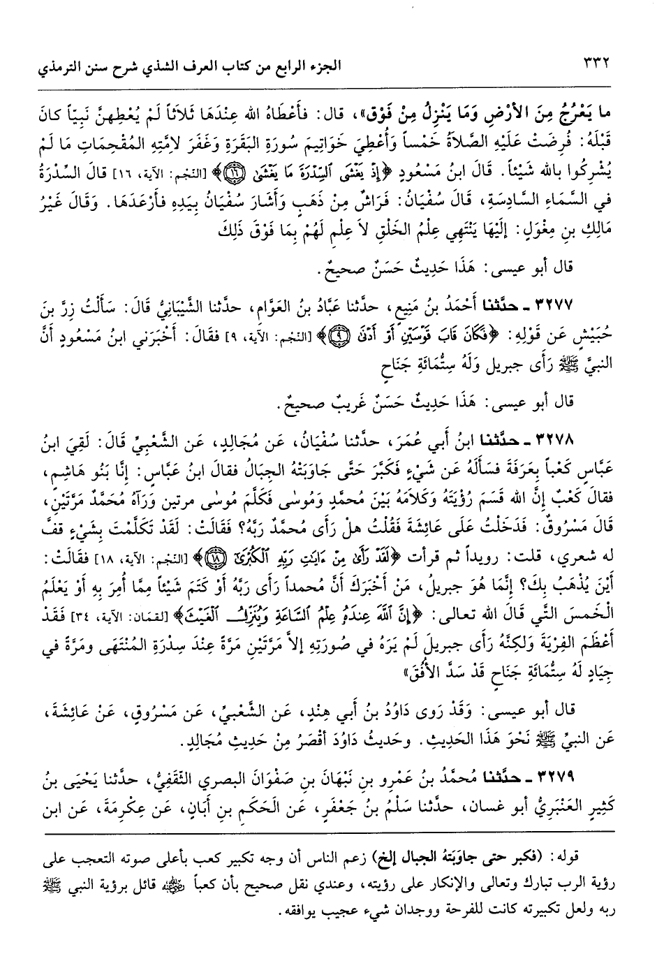 [3276] قوله: (فكبر حتى جاوَبَتهُ الجبال إلخ) زعم الناس أن وجه تكبير كعب بأعلى صوته التعجب على رؤية الرب تبارك وتعالى والإنكار على رؤيته، وعندي نقل صحيح بأن كعباً قائل برؤية النبي - صَلَّى اللهُ عَلَيْهِ وَسَلَّمَ - ربه ولعل تكبيرته كانت للفرحة ووجدان شيء عجيب يوافقه.