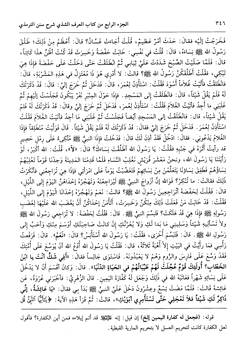 [3318] قوله: (فجعل له كفارة اليمين إلخ) إن قيل: إنه قد أتم إيلاءه فمن أين الكفارة؟ فأقول لعل الكفارة كانت لتحريم العسل لا بتحريم المارية القبطية.