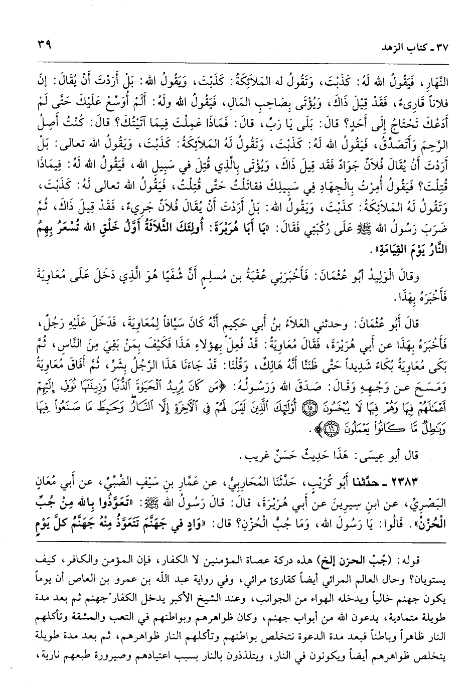 [2381] قوله: (جُبِّ الحزن إلخ) هذه دركة عصاة المؤمنين لا الكفار، فإن المؤمن والكافر، كيف يستويان؟ وحال العالم المرائي أيضاً كقارئ مرائي، وفي رواية عبد الله بن عمرو بن العاص أن يوماً يكون جهنم خالياً ويدخله الهواء من الجوانب، وعند الشيخ الأكبر يدخل الكفار جهنم ثم بعد مدة طويلة متمادية، يدعون الله من أبواب جهنم، وكان ظواهرهم وبواطنهم في التعب والمشقة وتأكلهم النار ظاهراً وباطناً فبعد مدة الدعوة نتخلص بواطنهم وتأكلهم النار ظواهرهم، ثم بعد مدة طويلة يتخلص ظواهرهم أيضاً ويكونون في النار، ويتلذذون بالنار بسبب اعتيادهم وصيرورة طبعهم نارية،