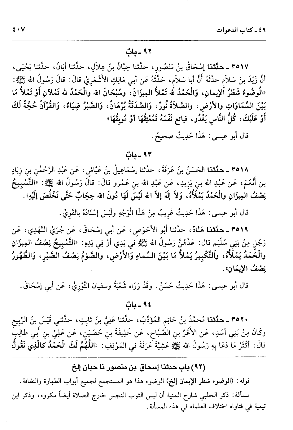 [3517] قوله: (الوضوء شطر الإيمان إلخ) الوضوء هذا هو المستجمع لجميع أبواب الطهارة والنظافة.