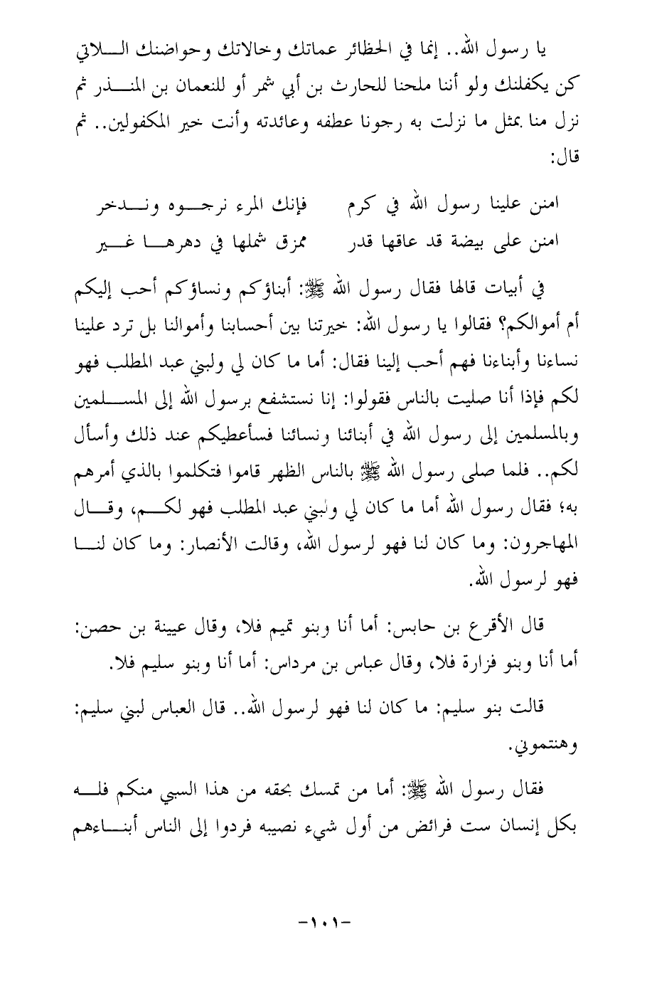 في أبيات قالها فقال رسول الله - صلى الله عليه وسلم -: أبناؤكم ونساؤكم أحب إليكم أم أموالكم؟ فقالوا يا رسول الله: خيرتنا بين أحسابنا وأموالنا بل ترد علينا نساءنا وأبناءنا فهم أحب إلينا فقال: أما ما كان لي ولبني عبد المطلب فهو لكم فإذا أنا صليت بالناس فقولوا: إنا نستشفع برسول الله إلى المسلمين وبالمسلمن إلى رسول الله في أبنائنا ونسائنا فسأعطيكم عند ذلك وأسأل لكم .. فلما صلى رسول الله - صلى الله عليه وسلم - بالناس الظهر قاموا فتكلموا بالذي أمرهم به؛ فقال رسول الله أما ما كان لي ولبني عبد المطلب فهو لكم، وقال المهاجرون: وما كان لنا فهو لرسول الله، وقالت الأنصار: وما كان لنا فهو لرسول الله.