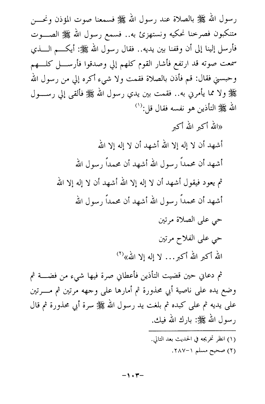 تم دعاني حين قضيت التأذين فأعطاني صرة فيها شيء من فضة ثم وضع يده على ناصية أبي محذورة ثم أمارها على وجهه مرتين ثم مرتين على يديه ثم على كبده ثم بلغت يد رسول الله - صلى الله عليه وسلم - سرة أبي محذورة ثم قال رسول الله - صلى الله عليه وسلم -: بارك الله فيك.