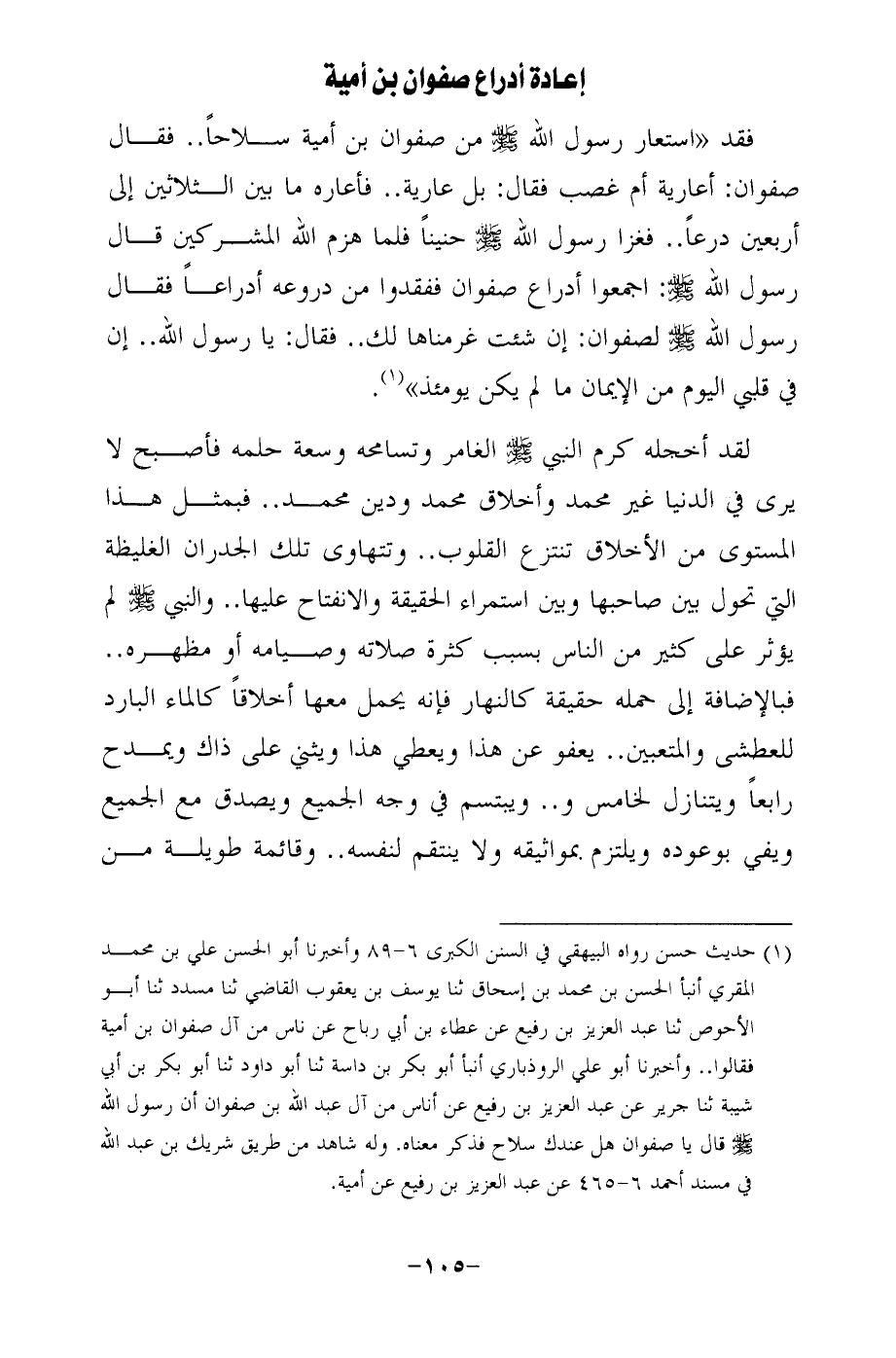 (¬1) حديثٌ حسنٌ رواه البيهقي في السنن الكبرى 6 - 89 وأخبرنا أبو الحسن علي بن محمَّد المقري أنبأ الحسن بن محمَّد بن إسحاق ثنا يوسف بن يعقوب القاضي ثنا مسدد ثنا أبو الأحوص ثنا عبد العزيز بن رفيع عن عطاء بن أبي رباح عن ناس من آل صفوان بن أمية فقالوا .. وأخبرنا أبو علي الروذباري أنبأ أبو بكر بن داسة ثنا أبو داود ثنا أبو بكر بن أبي شيبة ثنا جرير عن عبد العزيز بن رفيع عن أناس من آل عبد الله بن صفوان أن رسول الله - صلى الله عليه وسلم - قال يا صفوان هل عندك سلاح فذكر معناه. وله شاهد من طريق شريك بن عبد الله في مسند أحمد 6 - 465 عن عبد العزيز بن رفيع عن أمية.